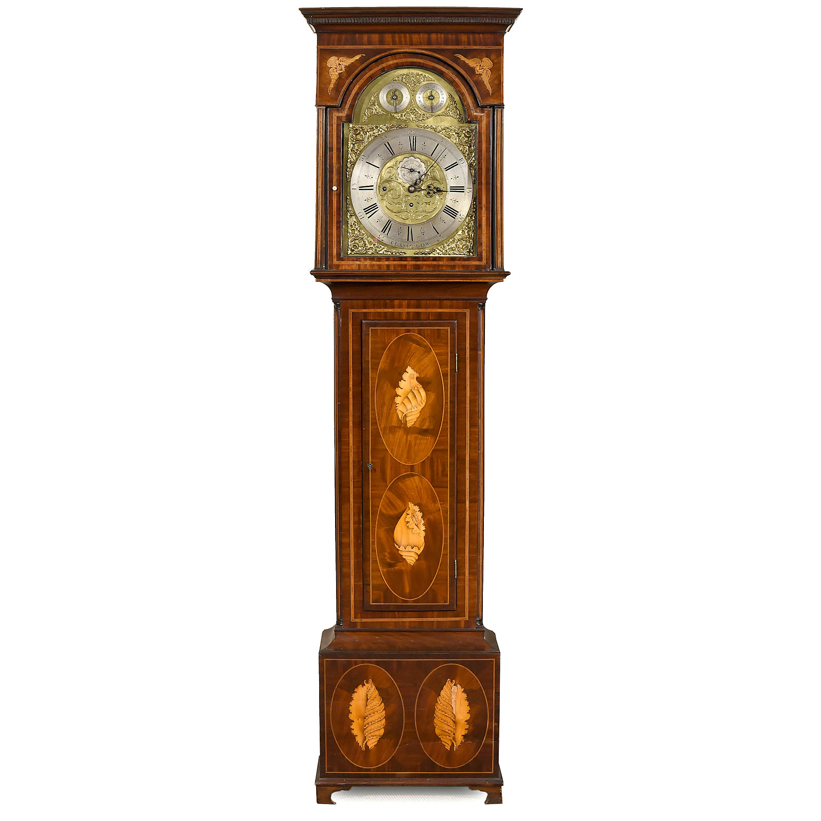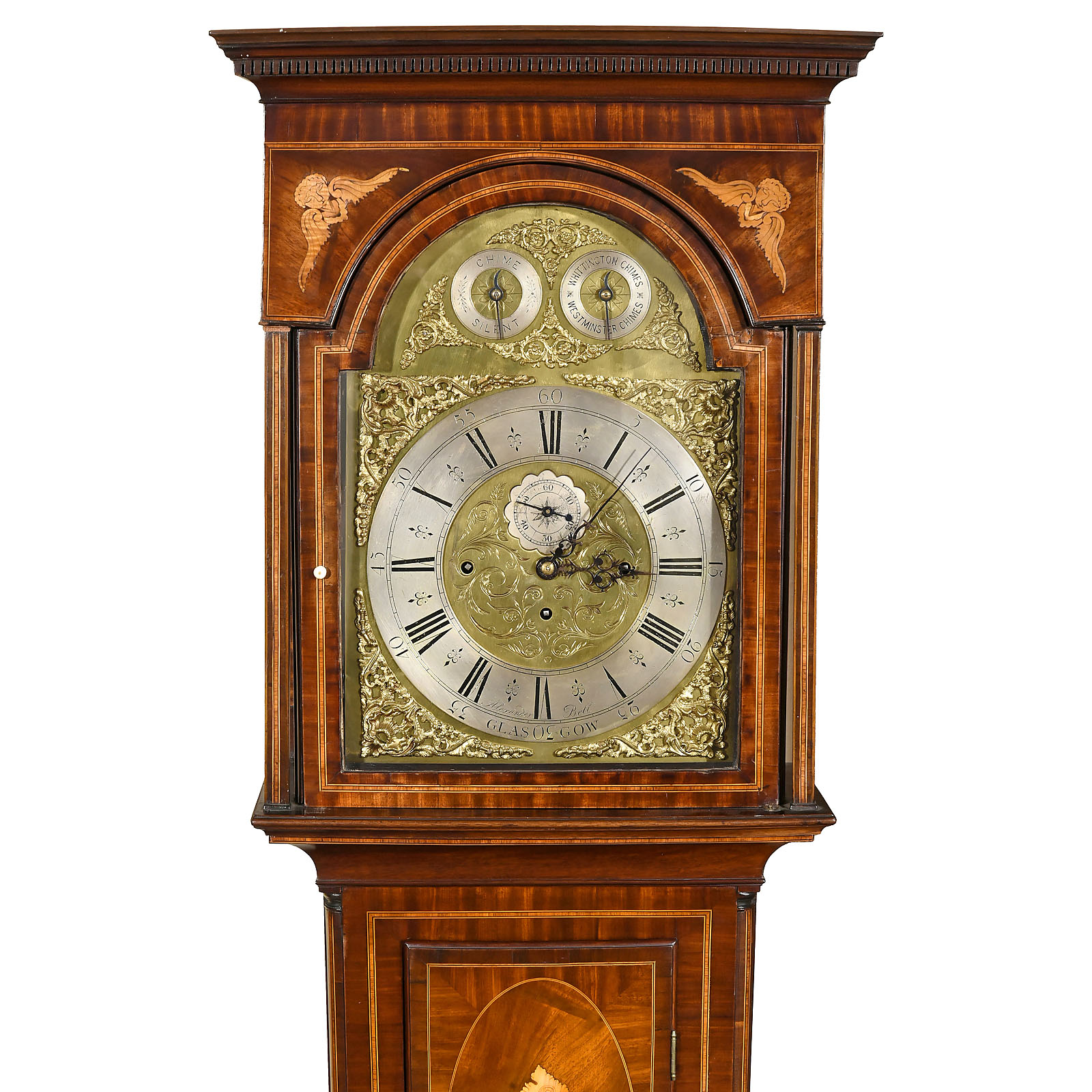 Signed "Alexander Bell, Glasgow". 3-train weight-driven movement, brass plates, hour strike on bell, quarter-release clock chime melody on 8 bells (Westminster and Whittington), small second, large brass dial, center with engravings, cast-brass ornaments, silvered hour ring, Sheraton-style case, rosewood veneer, shell and angel inlaid decoration, veneer with small damages, working, height 87 in.