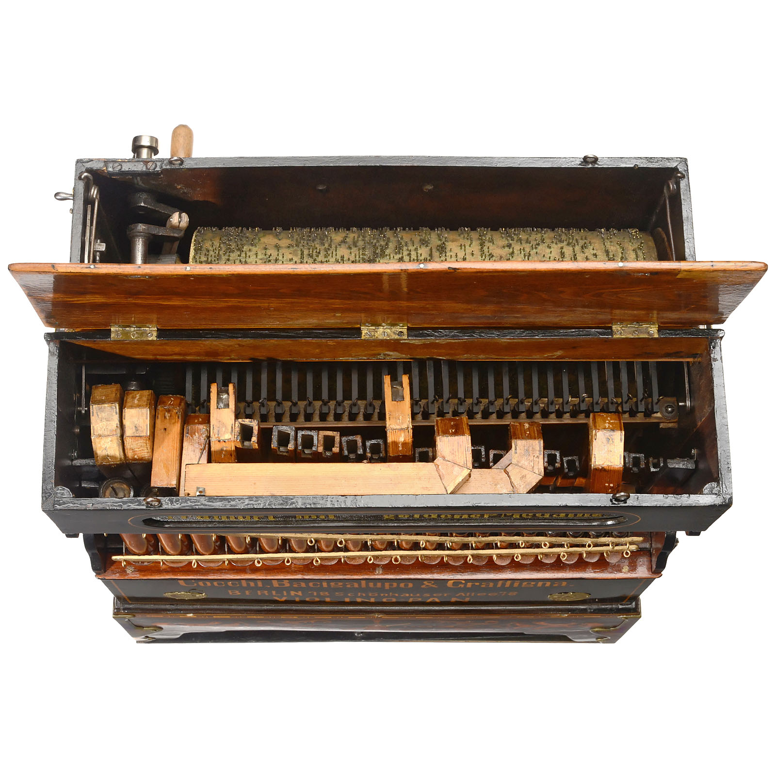 Model no. 20, signed: "Cocchi, Bacigalupo & Graffigna; Berlin, Schönhauser Allee 78". 32 keys, 8 tunes, 19 visible pan flutes, 1 register violin pipes, bass pipes, 2 stops, inlaid wooden case, 2 brass medals, good condition.