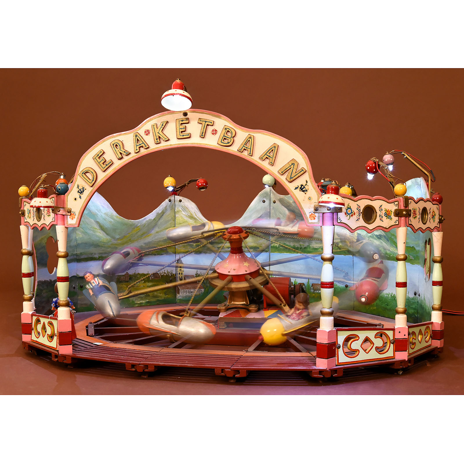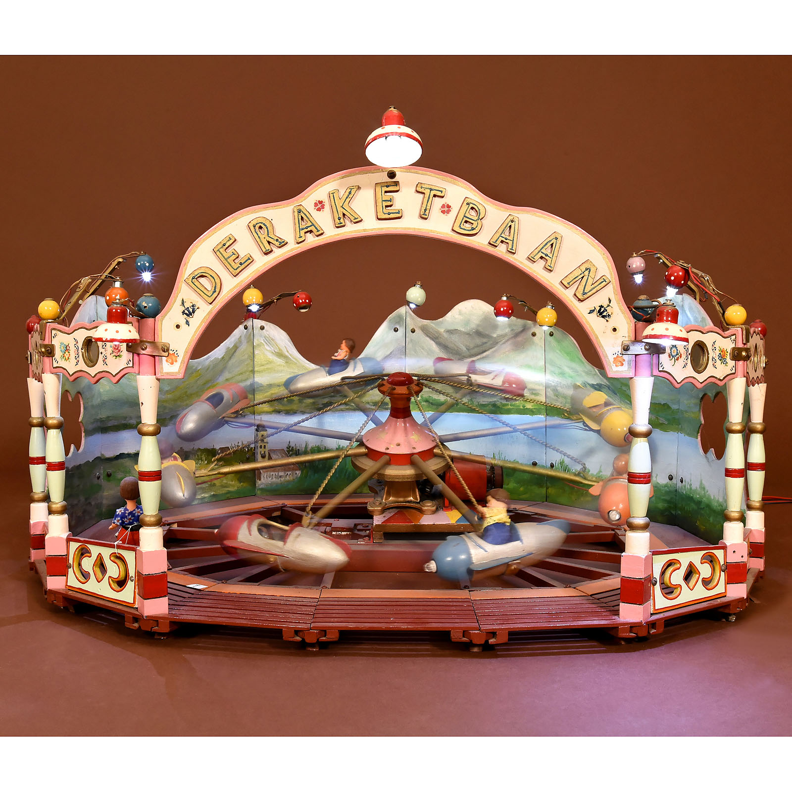 Detailed fairground model, named "De Raketbaan", constructed of wood, metal and mirrors, hand-painted and decals, 8 rockets, electric lighting (not all lamps light), electric motor drive (230 V, with transformer), overall size Ø 32 1/3 in., height 18 ¼ in., with several dolls. – Good working condition. All details, including the base structure corresponding to an original of the 30s to 50s. Especially the backdrop impresses with its realistic hand-painted fairground-style decoration.