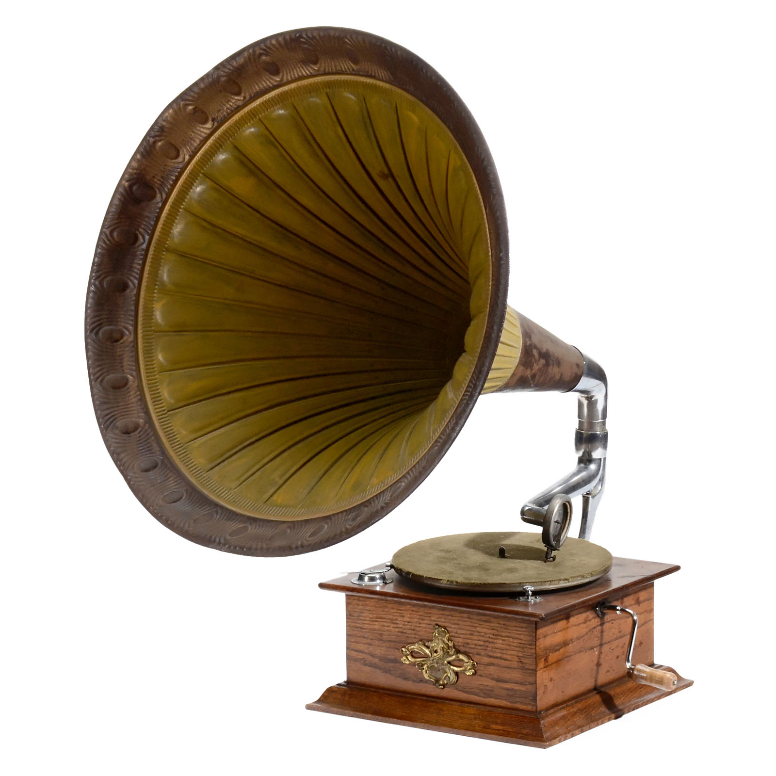 Oak case, front with embossed brass plaque, Maxitone Junior soundbox, Ø 22 ½ in. metal horn, clockwork, working.