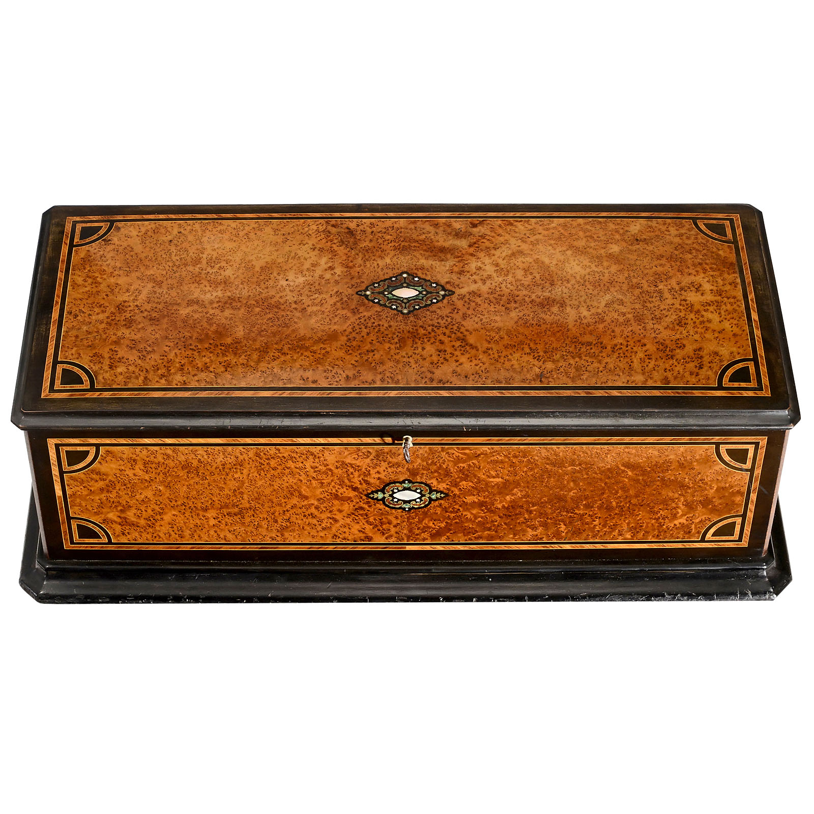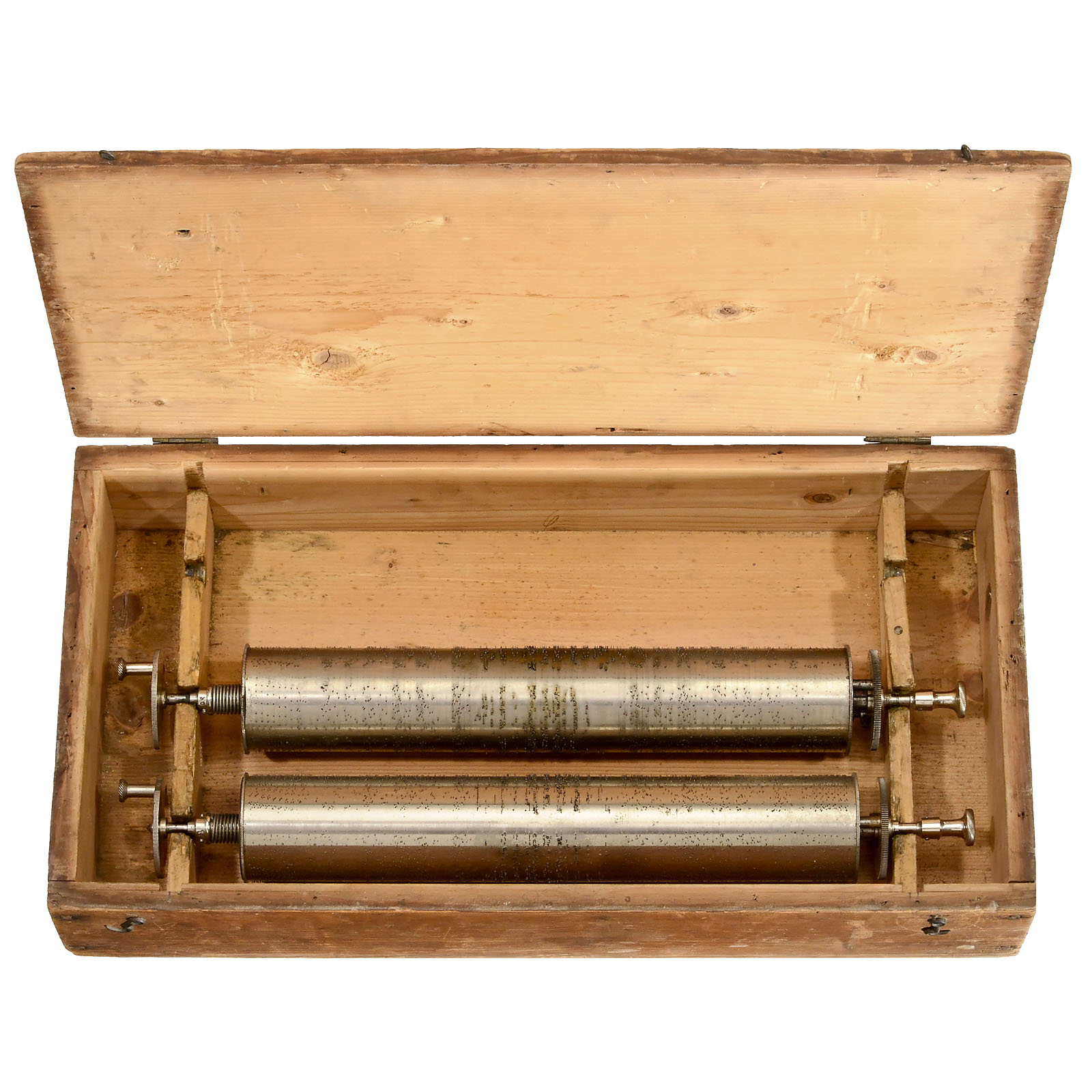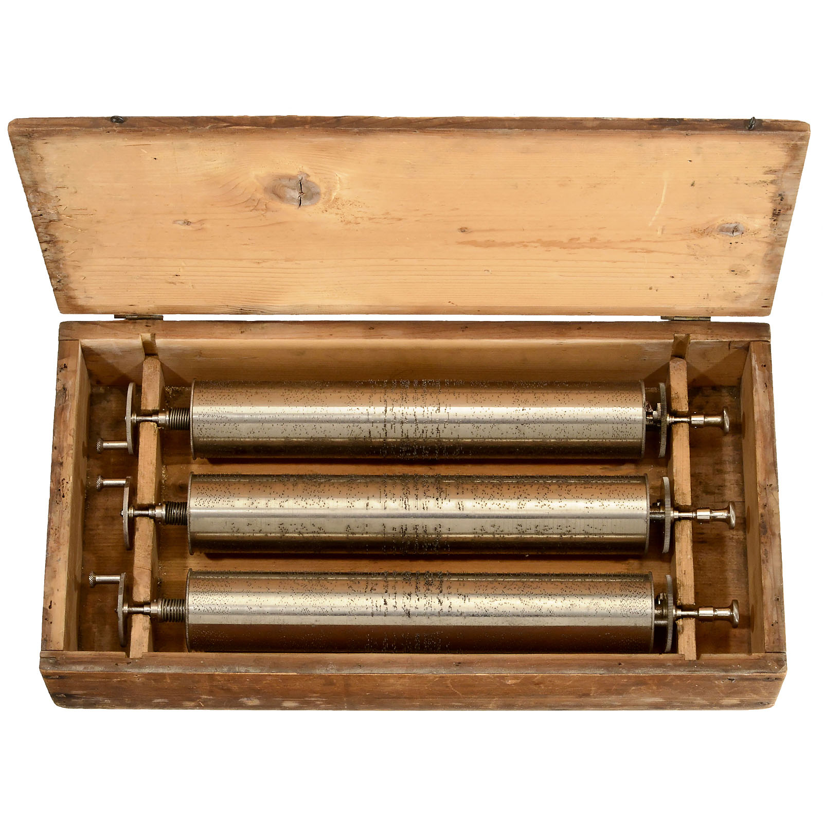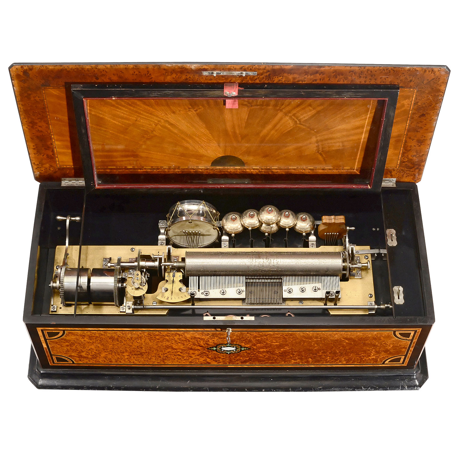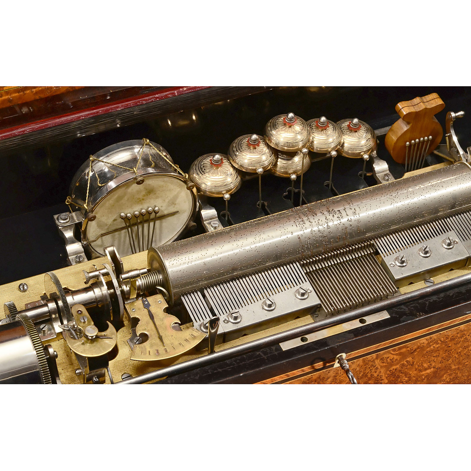 No. 16, with six 8-air cylinders, with 56 musical teeth in two combs, 18 percussion teeth and 24-key organ (all combs complete), accompanied by optional drum, castanet and six engine-turned bells, nickel-plated double-spring motor, tune-indicator, tune-selector and speed control, in thuya-and-ebony-veneered case with original finish, brass, mother-of-pearl, kingwood and imitation malachite, inlaid motifs on front and lid, figured inlaid lid interior and berelled-glass inner lid, 38 in. (97 cm) wide, cylinders 14 in. (36 cm), one drum tooth replaced, with 2 original cylinder-storage boxes. An exhibition-quality full-orchestral musical box in superb playing condition!