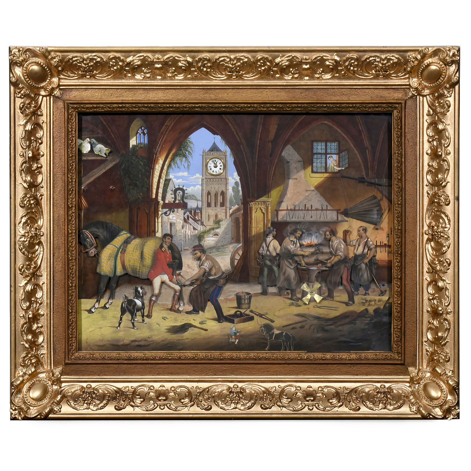 Paris, hand-colored lithograph of a cavernous room with village scene visible through an arch, two pigeons roosting in beams on the upper left side and a lady leaning into the room from a window on the right. With 1 ¼-inch (3,5 cm) enameled Roman dial, two-train movement striking on a gong and two-air pull-string cylinder musical movement activating: two blacksmiths working with hammers, a third operating bellows while a fan turns, a farrier shoeing a horse and a dog wagging its tail. In refinished giltwood and gesso frame. 29 ½ in. (75 cm) x 36 in. (92 cm), cylinder movement an old replacement, modifications to the linkages, good working order but clock not tested for accuracy.