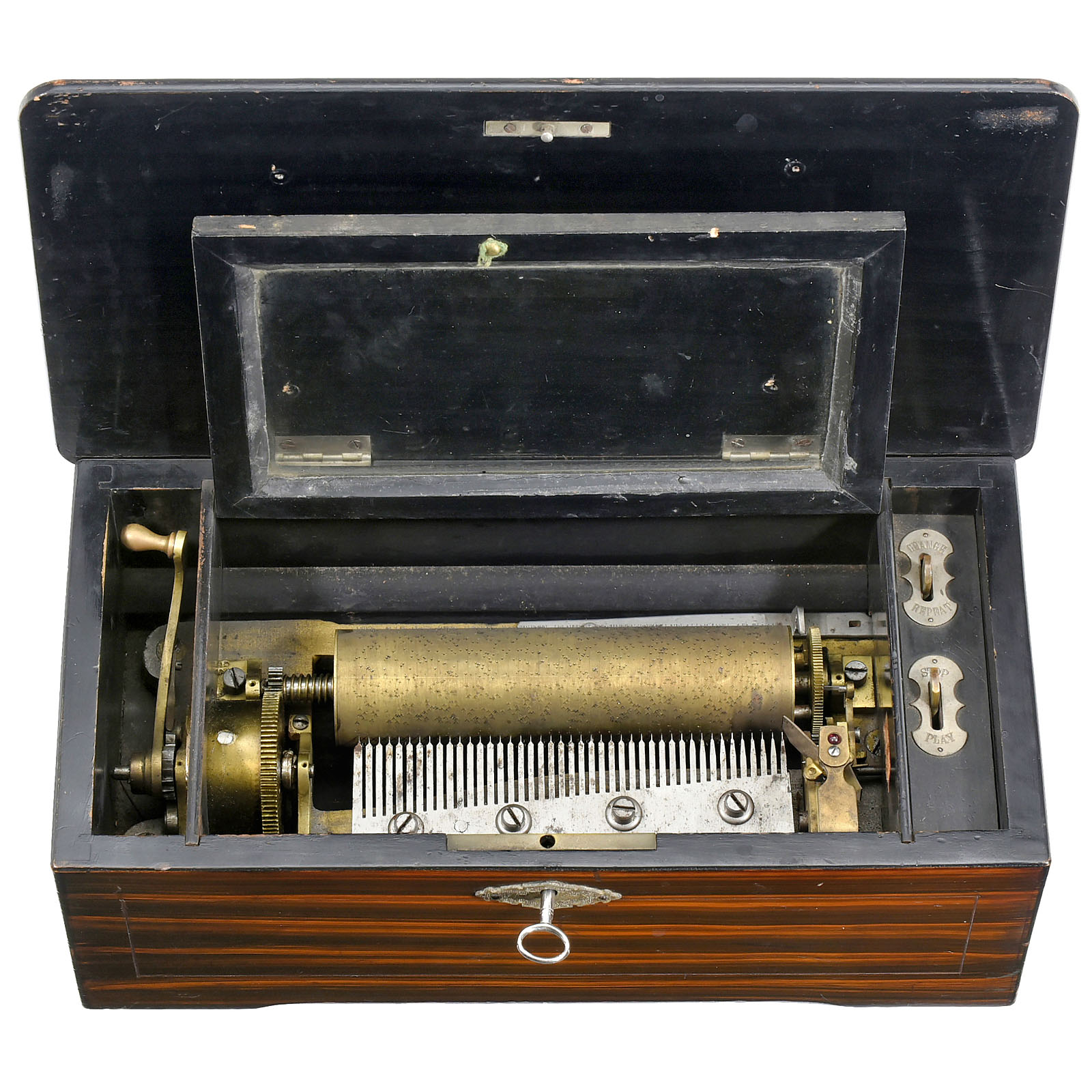 No. 33025, playing 8 airs, with 43 teeth in comb (complete but one tip bent), in grained case, width 13 ½ in. (34 cm), cylinder 6 ¼ in. (16 cm), unrestored condition.
