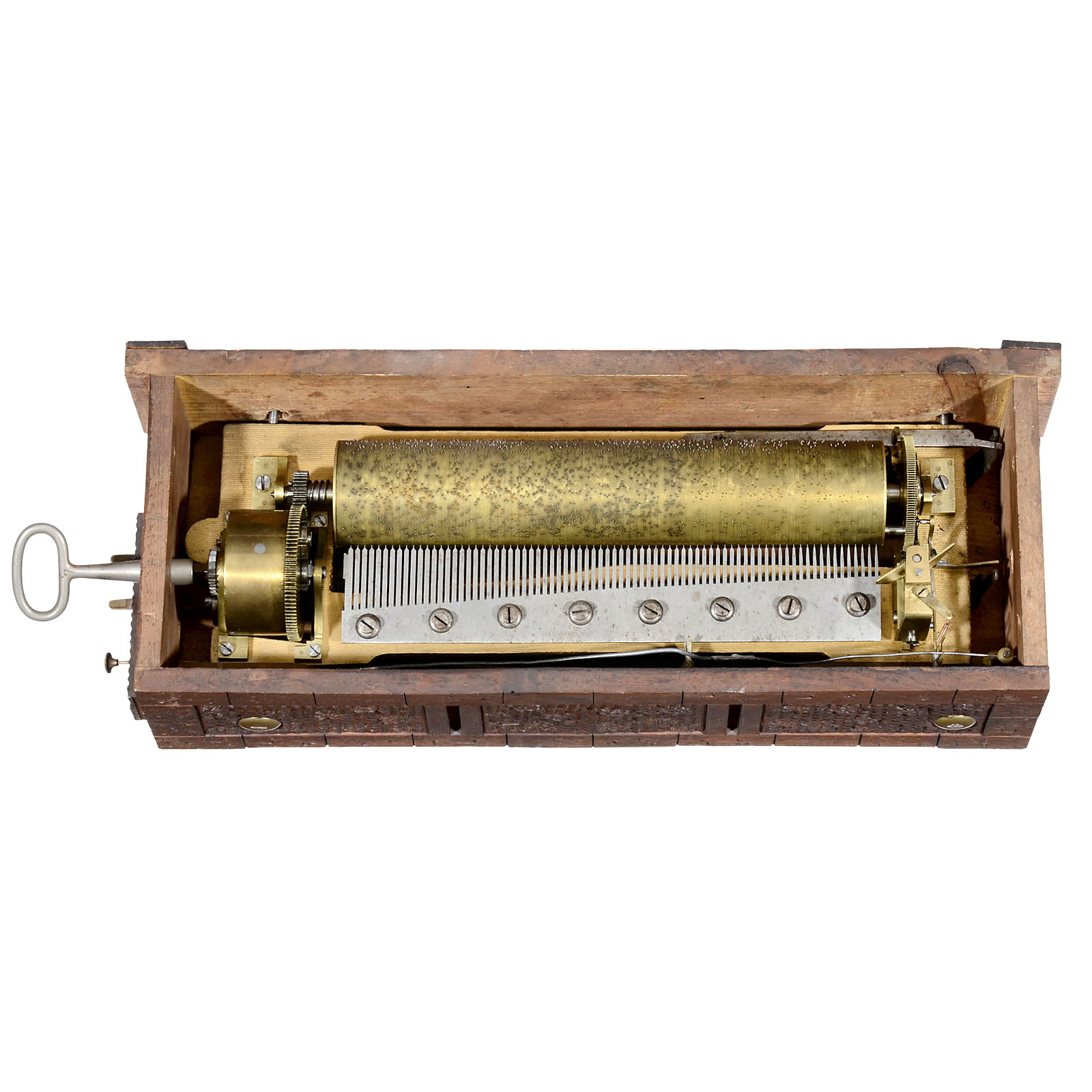 With key-wind Swiss 8-air movement, probably by B.A. Bremond, 77 teeth in steel comb (complete), instant stop, detailed carved wooden case, with doors and gates, mirrored windows, steps, railings, stack of wood, kennel, beehives, roofing shingles (probably replaced) and further details, front top with integral clock by Leuenbergen, Interlaken, no. 1620, half-hour strike on bell, hourly activation of the musical movement (missing connecting string), overall size 20 x 12 ¼ x 17 ¾ in. – Very good original and playing condition.