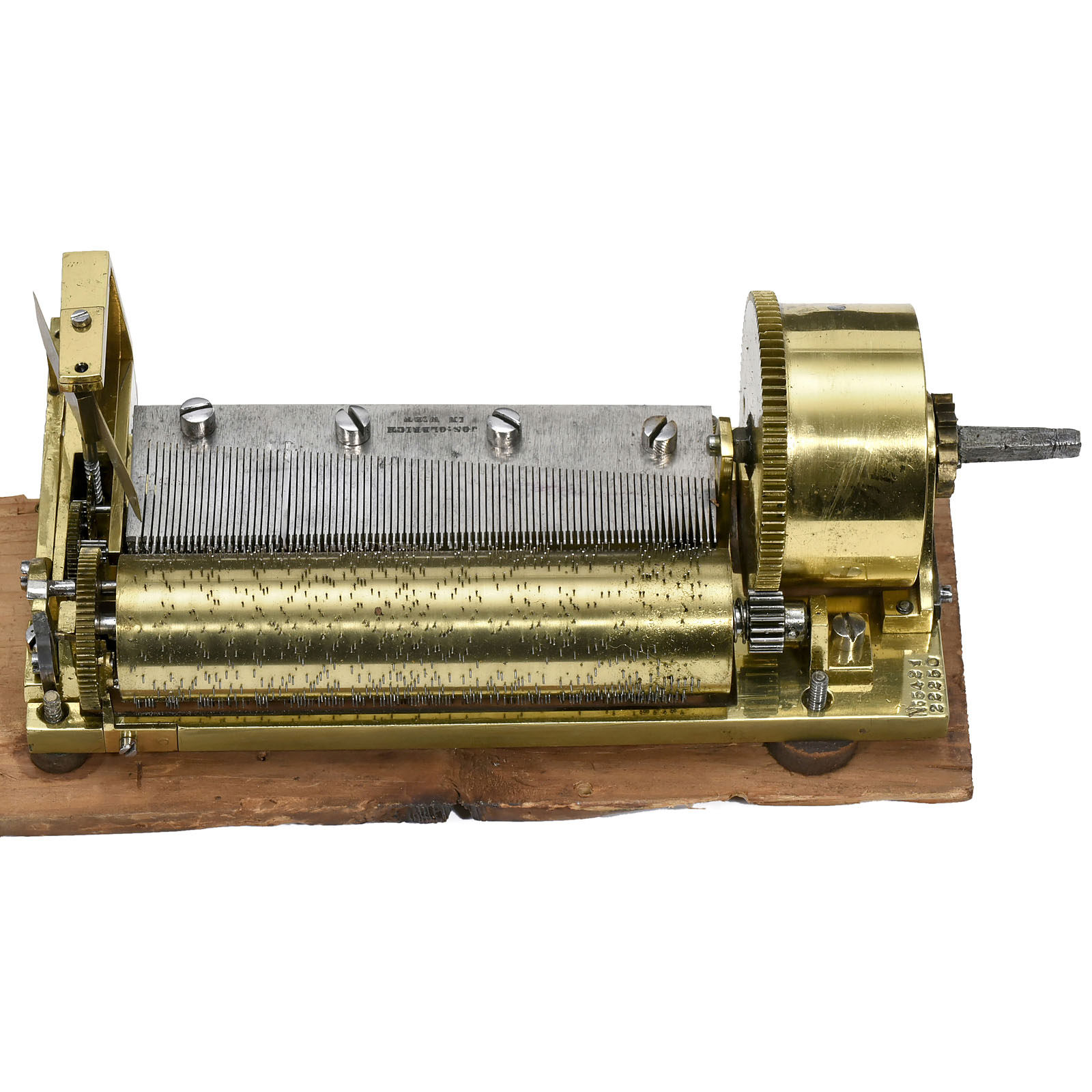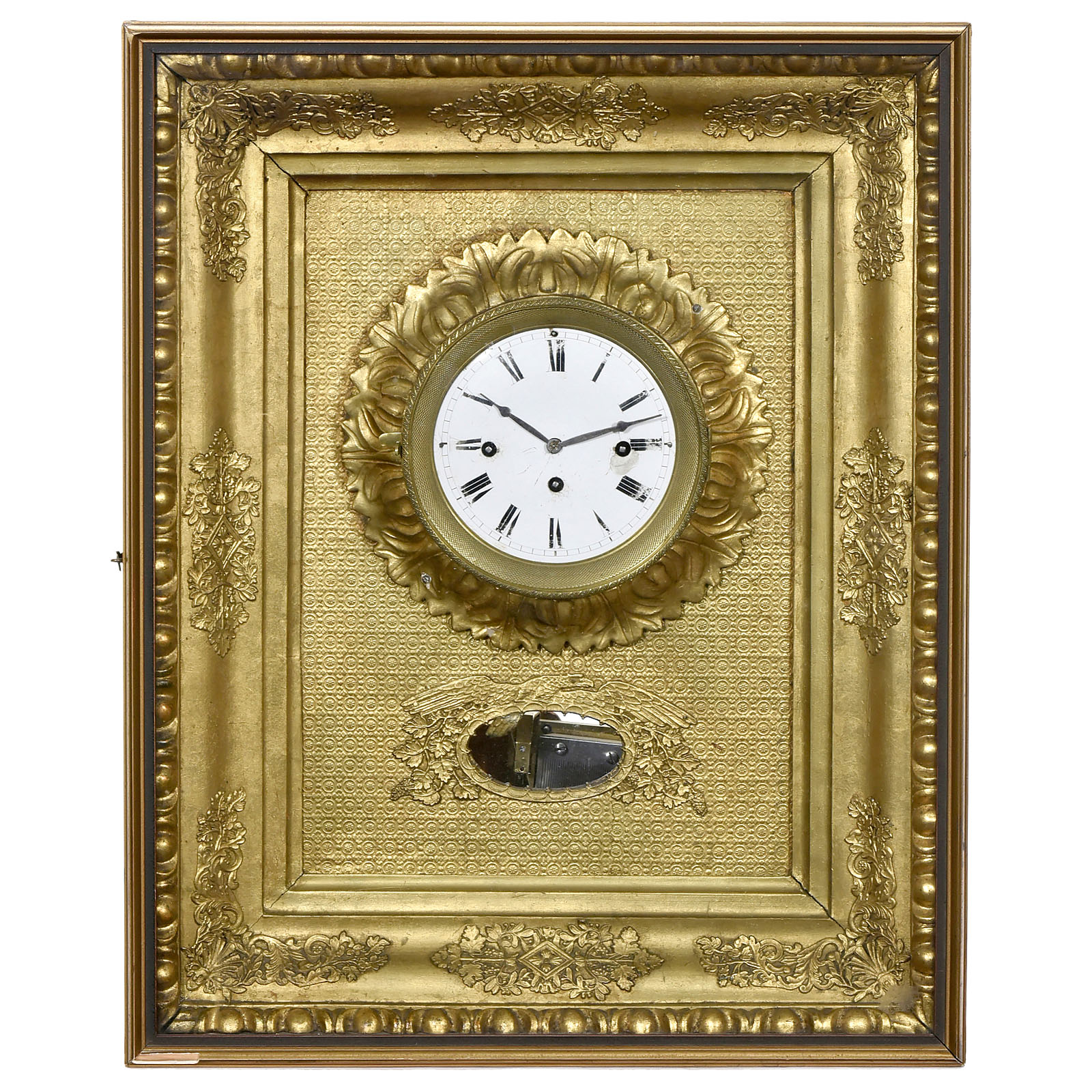 With 5-inch (13 cm) enameled Roman dial, three-train grand-sonnerie movement striking on special gong, two-air cylinder movement by "Jos. Olbrich in Wien", no. 5421/22250, with 85 teeth in comb (complete, one tooth replaced), and giltwood and gesso frame, 17 in. (48 cm) x 21 ½ in. (54 cm), with two keys and pendulum, chips on dial, cylinder movement in excellent restored playing condition!
