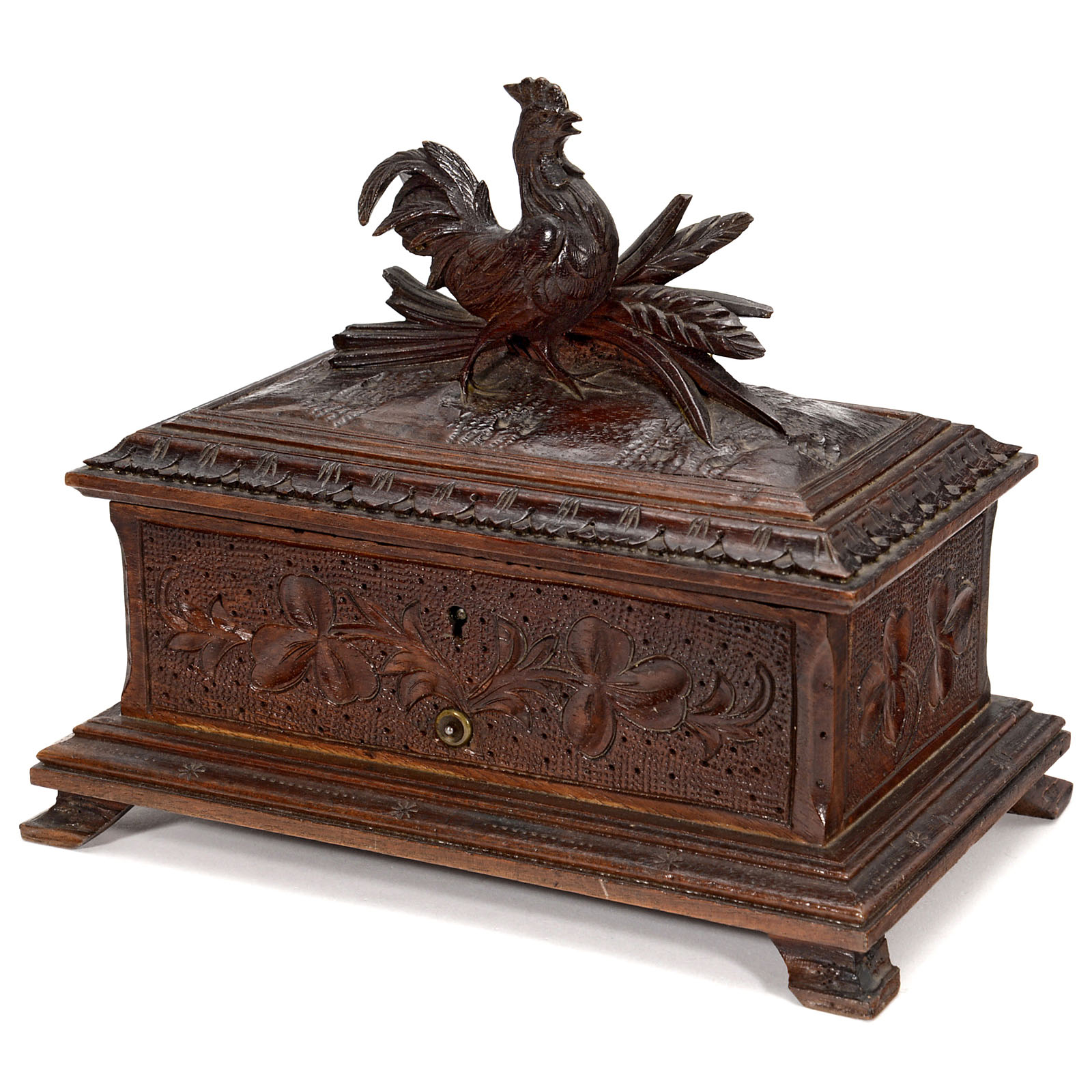 Tabatière movement playing 6 mixed airs including the "Krondiamanten Overture" and "Fra Diavolo Arie", with 51 teeth in comb (complete), tune-sheet and carved walnut case with 3-dimensional rooster and sheaf of corn decorating the lid, width 8 ½ in. (21,5 cm), cylinder 3 ½ in. (9 cm), spring in need of overhaul/repair.