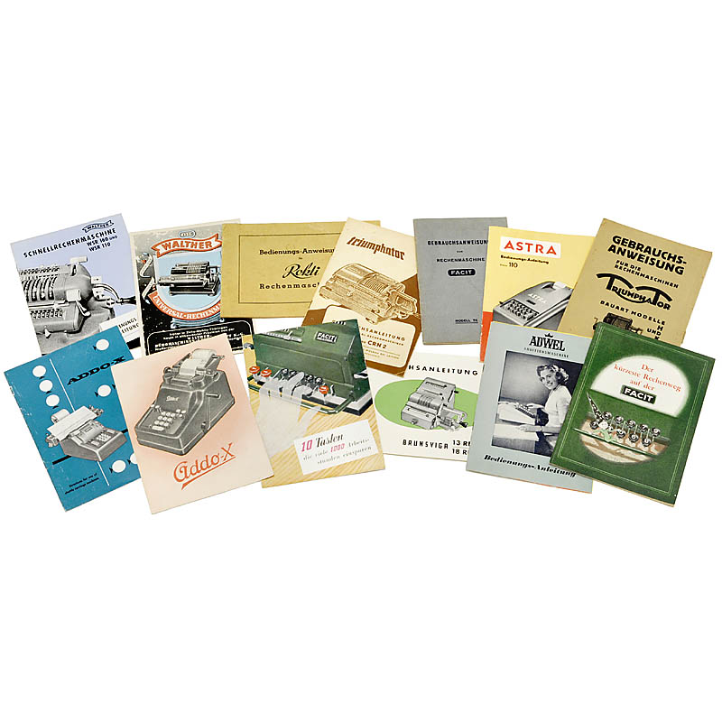 80 多本册子 (多半是德文). 以下制造商: Facit, Addo, Olympia, Addiator, Brunsviga, Schubert, Adwel, Faber Castell, Walther,Totalia, Thales, Olivetti, Odhner 等公司