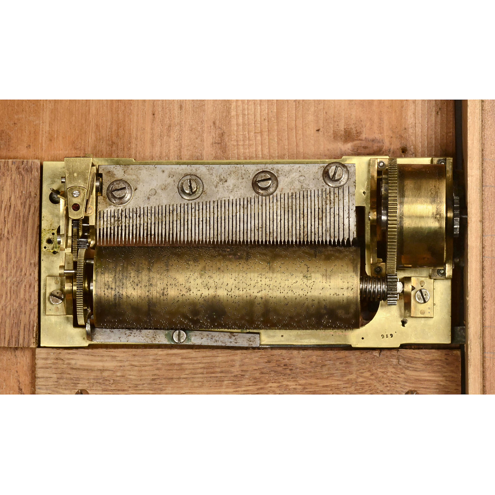 Paris, hand-colored lithograph depicting a harbor scene with abbey, fountain, viaduct and watchtower on a hill, with two-train clock movement (No. 108) striking hours and halves on gong, 2 1/4-inch (5.5 cm) enameled Roman dial, key-wind four-air cylinder movement (No. 617) with 68 teeth in comb (complete), tune-sheet listing two dance airs and two operatic airs by Verdi and Meyerbeer, operating instructions and going-barrel automaton movement, in giltwood and gesso frame, 27 x 36 in. (69 x 92 cm) unframed, 32 x 41 in. (82 x 104 cm) framed, good original working condition, edges of picture taped. The movement activates: nodding friar reading in a tower room, musician nodding his head as he strums a lute, twisting glass rod in the fountain, lady mending net by the harbor wall, a rocking ship in the foreground and two more on the horizon, a locomotive passing over the viaduct and the flag on the watchtower fluttering in the wind. – A beautiful exhibition piece in good working order. – Reference: Auction Team Breker, 25 May 2013, Lot 430 for a similar piece.