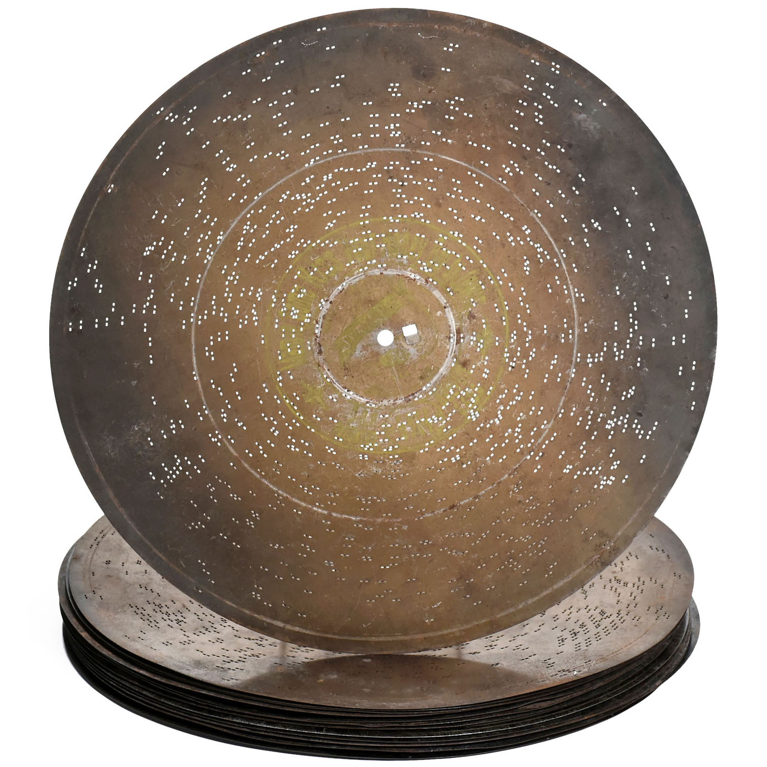 For discs of 13 5/8 in. diameter discs, manufactured by Symphonion Musikwerke Leipzig, with 100 teeth in duplex combs (complete), lid with English instructions and dealer's label: "C.I. Heppe & Son, Philadelphia", good restored and playing condition, with 15 discs.