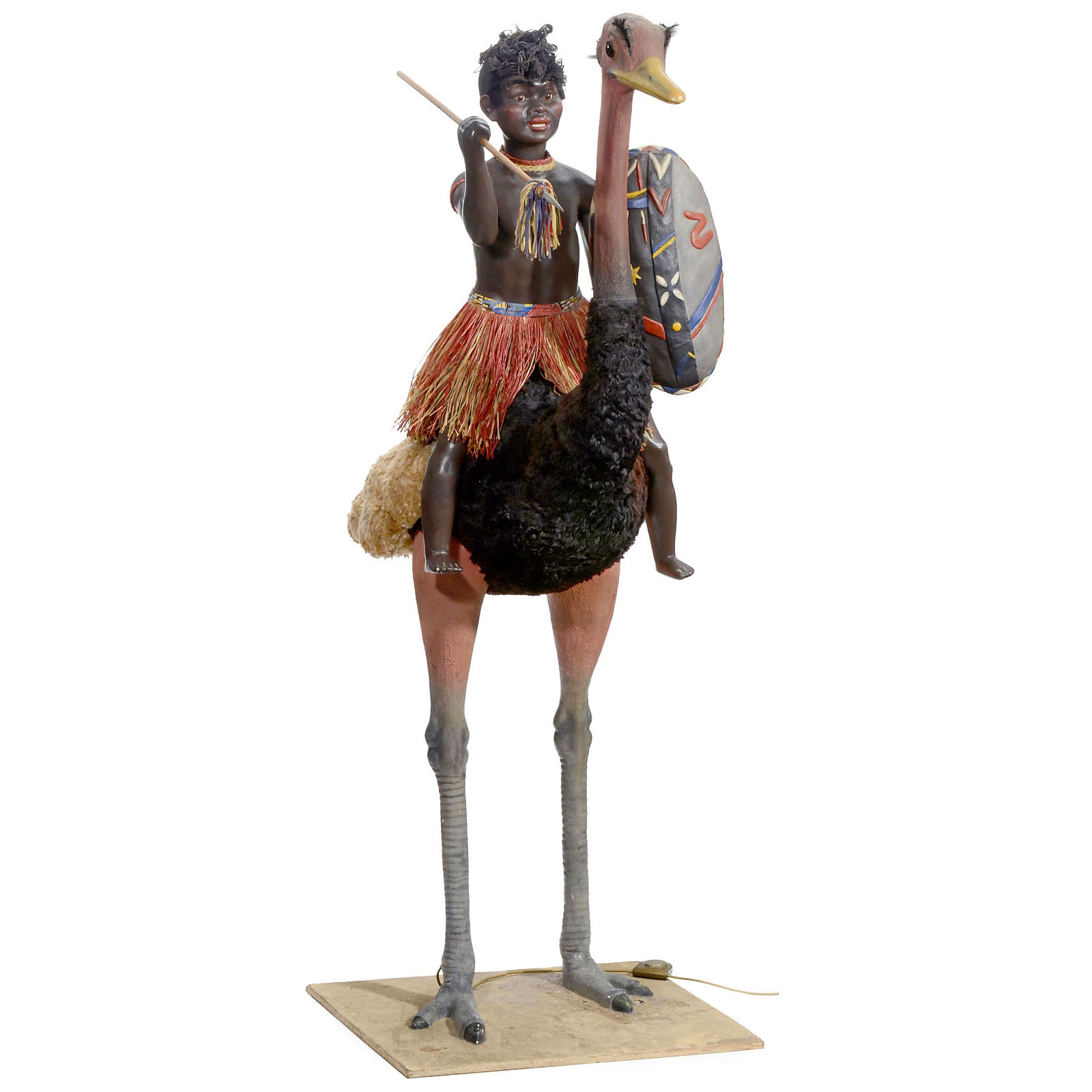 Probably Germany, depicting a boy with plaster-composition head, articulated eyes, eyebrows and lower lip riding an ostrich with articulated neck, beak, tail and illuminated eyes, the boy with papier-mâché body, hands holding shield and spear, the ostrich's torso containing 220-volt electric motor, boy 37 in. (94 cm), ostrich 74 in. (188 cm) high, boy's lower legs unobtrusively replaced. Working condition. – "Babaloo" turns and nods his head, raises his eyebrows and moves his lower lip as "Oswald" cranes his neck, flutters his tail and snaps his beak open and shut. – This automaton was part of a collection of life-sized characters offered by the Hess Brothers department store in Allentown, Pennsylvania, for Christmas 1953. – References: "Ogden Standard Examiner", 17 December 1953, p. 4. – "The kids are having a circus at the Hess Brothers' big Toyland in Allentown, Pa., where a collection of life-sized imported circus characters is on display – and for sale at non-budget prices. Parents all over town are reaching for their headache remedies as the children clamour for the animated creations, which are said to make up the only collection of its kind in this country. If Daddy has a few dollars left over after paying the rent and groceries, he can buy Junior a room-filling elephant, "Sultan," complete with Maharajah, for only $4,895. If that's a little steep, "Oswald," the ostrich, can be had for a mere $1,250, and if you're really tight for cash, "Frosty," the polar bear, can freeze your spending money at $850". – A rare and humorous advertising automaton.