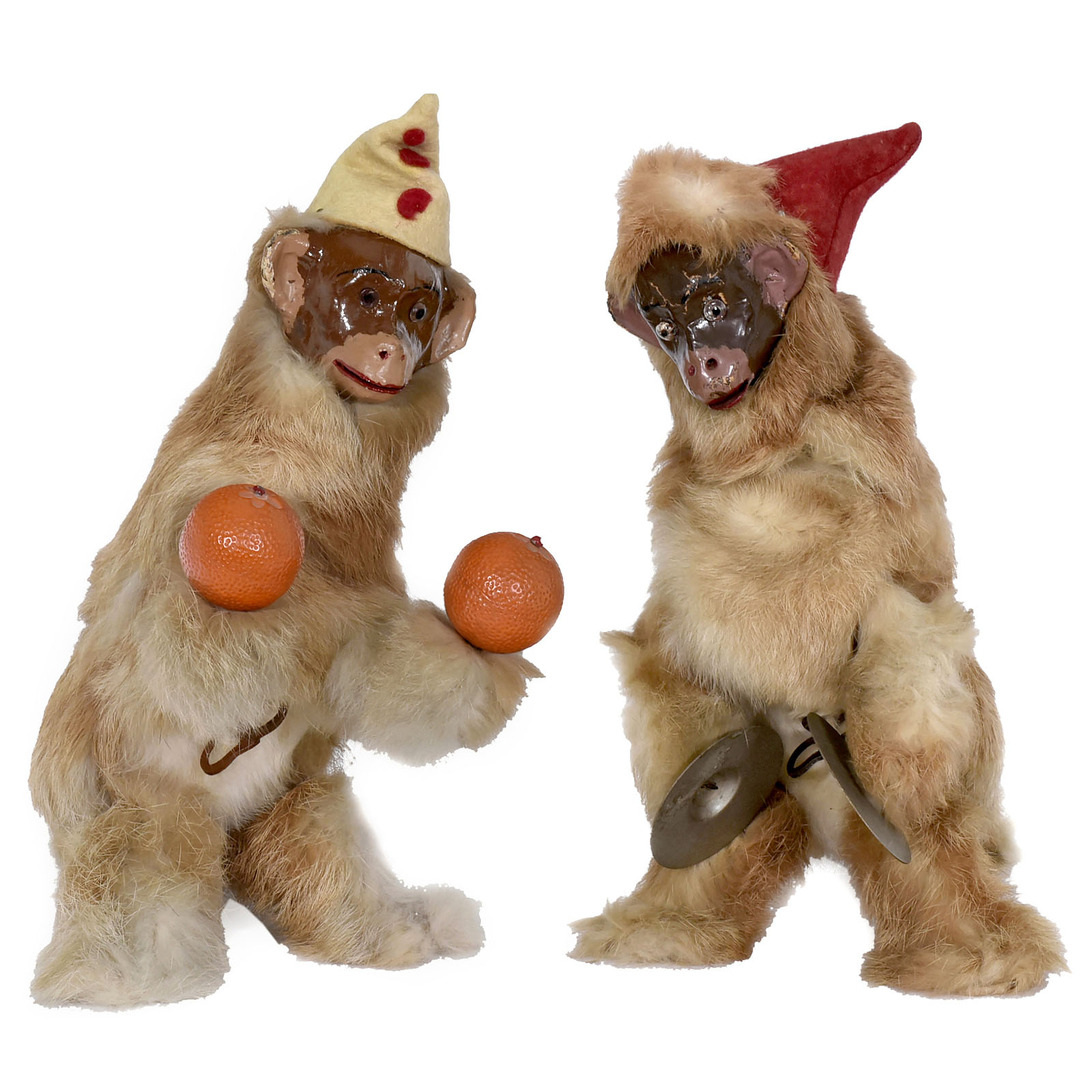 France, probably Martin/Le Zoo Mécanique. With fur-covered papier-mâché bodies, painted faces, glass eyes (one missing, one chipped) and felt hats, one monkey holding cymbals, the other celluloid maracas, with open-spring mechanisms in their bodies causing the monkeys to bounce up and down, move their heads and play their instruments, ht. around 12 in. (30 cm), some paint wear and splitting on faces and ears. Attractive pair, in working condition. – Literature: François & Danielle Theimer, "Elie Martin", p. 108 for similar piece.