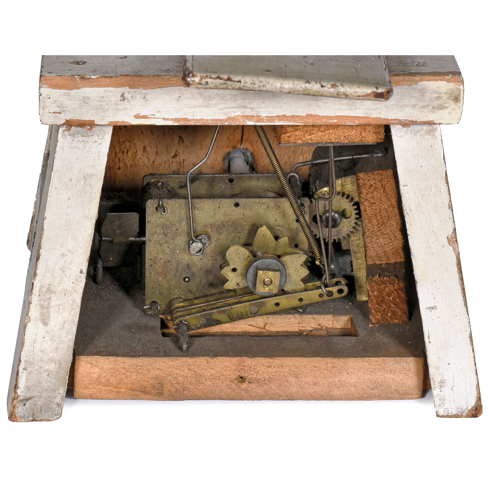 With plaster-composition head, original paint (small chip on left cheek), fixed brown glass eyes, metal hands holding a plate and a ball on poles, balancing with one leg on a large blue-painted ball which in turn rests upon a plank, on trestle base containing going-barrel movement, two cams, eccentric crank and two-air cylinder movement, in very worn original velvet and satin costume, ht. 25 in. (64 cm) including ball, with acorn stop/start and key monogrammed "H.V.". Inside the base is a pencil inscription with date "22 Decembre 94", No. 2, initials "VD" and a maker's label: "Henry Vichy, 36 Rue Montmorency, Paris". – Balancing on the ball, which tilts back and forth on the plank, the equilibrist bends to the left and right, moves his head and his right arm. The automaton is in original unrestored working condition. – Please see Lot 628 in this auction for another Vichy automaton with similarly inscribed date. Provenance: From information supplied by the vendor, the automaton was previously in the collection of the artist (Sister) Corita Kent (1918–1986). Kent taught at the Immaculate Heart College in Los Angeles, California, until leaving the order of the Sisters of the Immaculate Heart in around 1966. The automaton may originally have formed part of the college's collection of folk art, which was auctioned at Sotheby's, New York, on 13–15 July 1975. The automaton passed to the vendor after Kent's death in 1986. We know of only one other example of this automaton, illustrated in Annette Beyer, "Die faszinierende Welt der Automaten", p. 196. A letter of provenance from the vendor accompanies this lot. – A rare and charming figure.