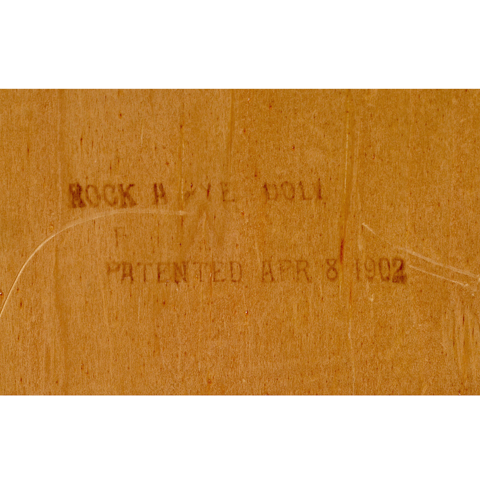 Scarce American mechanical toy depicting a mother rocking her baby, with German bisque head impressed "192, 5/0", open mouth, weighted brown glass eyes, five-piece composition body with molded shoes, original blonde mohair wig and probably original dotted tan dress, figure supported by brass clips mounted on two pegs and a wire loop in her right hand that attaches to pivoting white-painted cradle, the open-spring motor causing cradle to move to and fro with the illusion that the mother is rocking it herself! In the cradle lies an all-bisque baby with mohair wig, molded yellow boots and lace-edged chemise, on oak base ink-stamped "Rock A Bye Doll, Patented Apr. 8 1902", height 12 ¾ in. (32 cm), with steel key, paint wear on cradle but overall good original working condition.