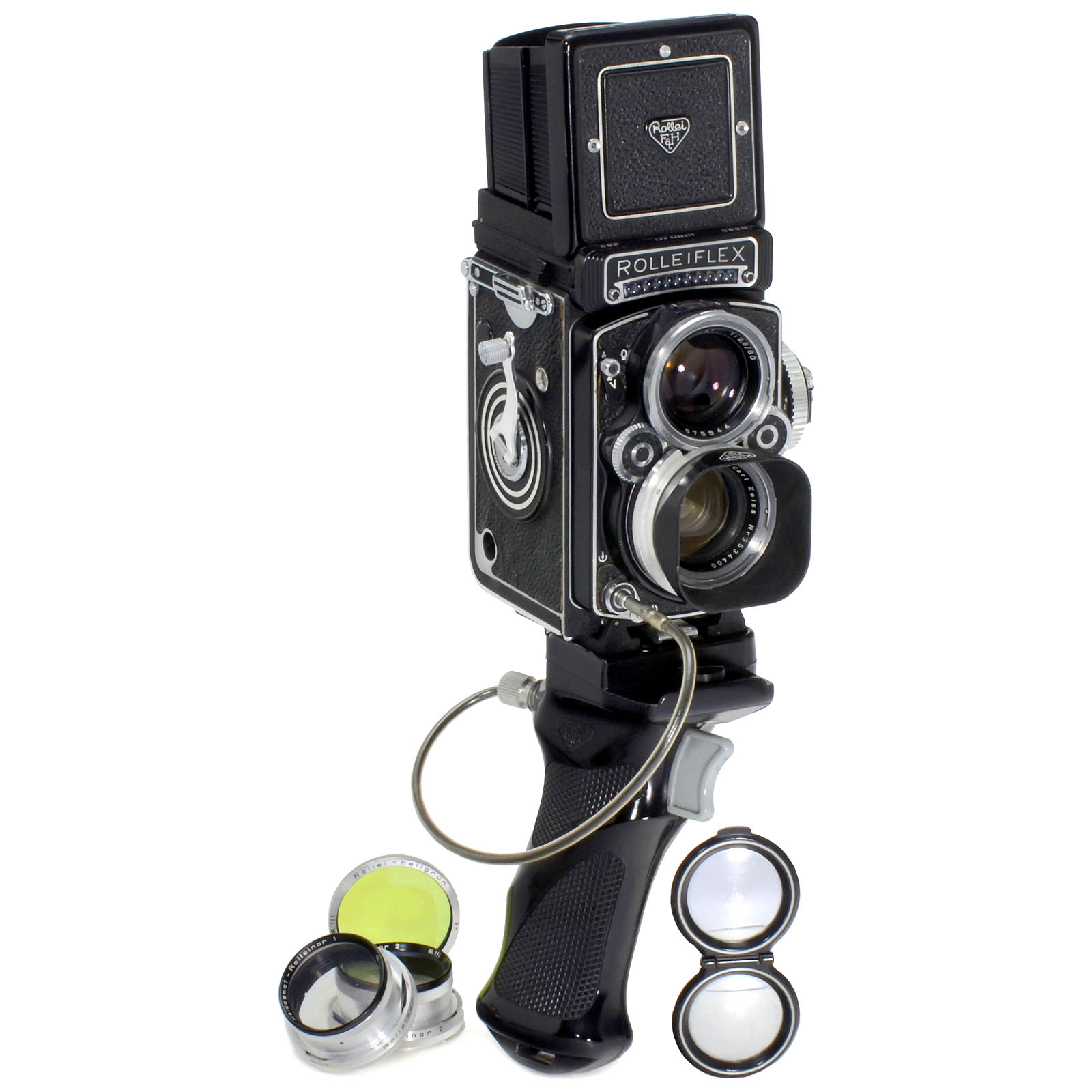 Franke & Heidecke, Braunschweig. No. 2,8 F 2425339, Planar 2,8/80 mm, no. 3534400 in Synchro-Compur. – In addition: Grip, maker's case, Rolleinar 1 and 2, lens hood, filter and lens cap.
