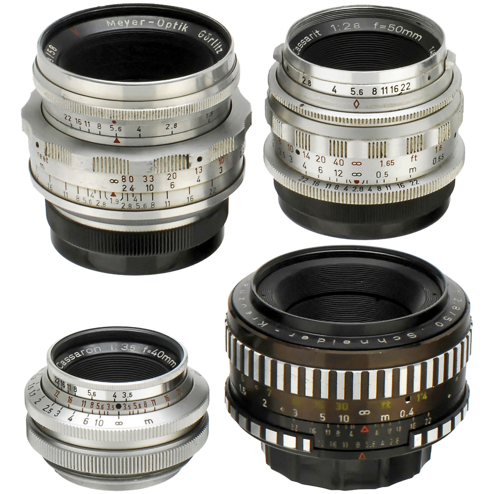 1) Steinheil. Cassaron 3,5/40 mm, no. 1726545, with box. (2/2) – 2) Steinheil. Cassarit 2,8/50 mm, no. 1489853, pre-set diaphragm system, 2 caps. (2-/2) – 3) Schneider. Xenar 2,8/50 mm, no. 9109646, automatic diaphragm (sluggish). (2-/3-) – And: 4) Meyer-Optik. Primoplan 1,9/58 mm V, no. 1291517, diaphragm slightly oily, 2 caps. (2-/3)