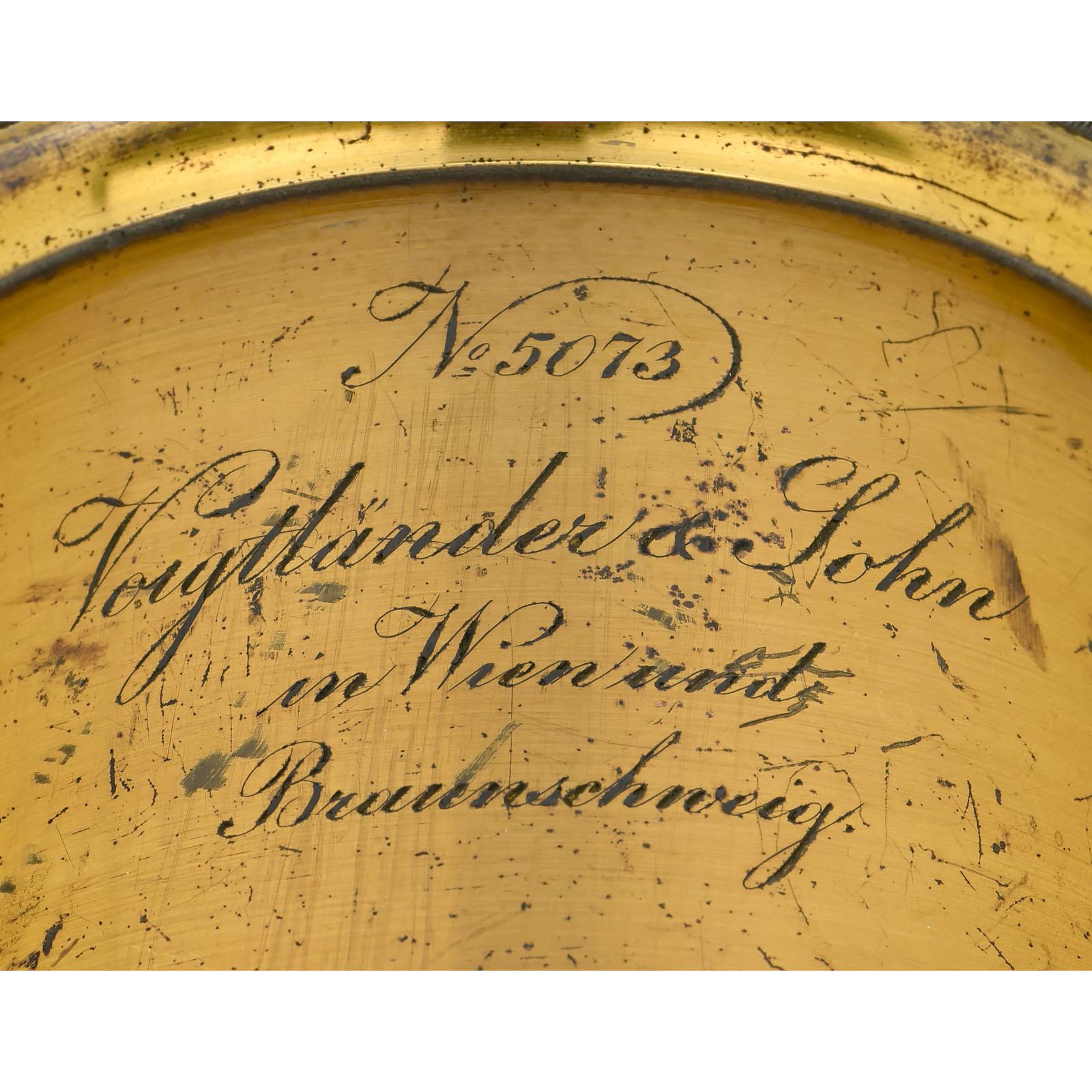 Voigtländer & Sohn in Wien und Braunschweig. No. 5073, approx. 25 cm focal length, front elements Ø 3 1/6 in., rack-and-pinion focusing missing, lens Ø 4 ¾ in., height of the lens (with lens hood) 7 4/5 in., connecting ring Ø 5 ½ in.
