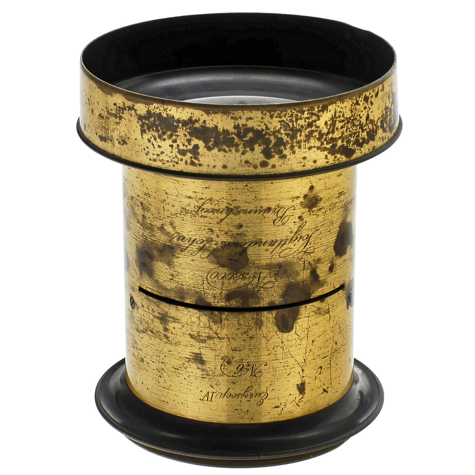 Voigtländer, Braunschweig. No. 38000, focal length approx. 55 cm, height of the lens with hood 6 ¾ in., lens diameter 3 ½ in., for waterhouse stop. Universal lens by Voigtländer for portrait and landscape pictures.