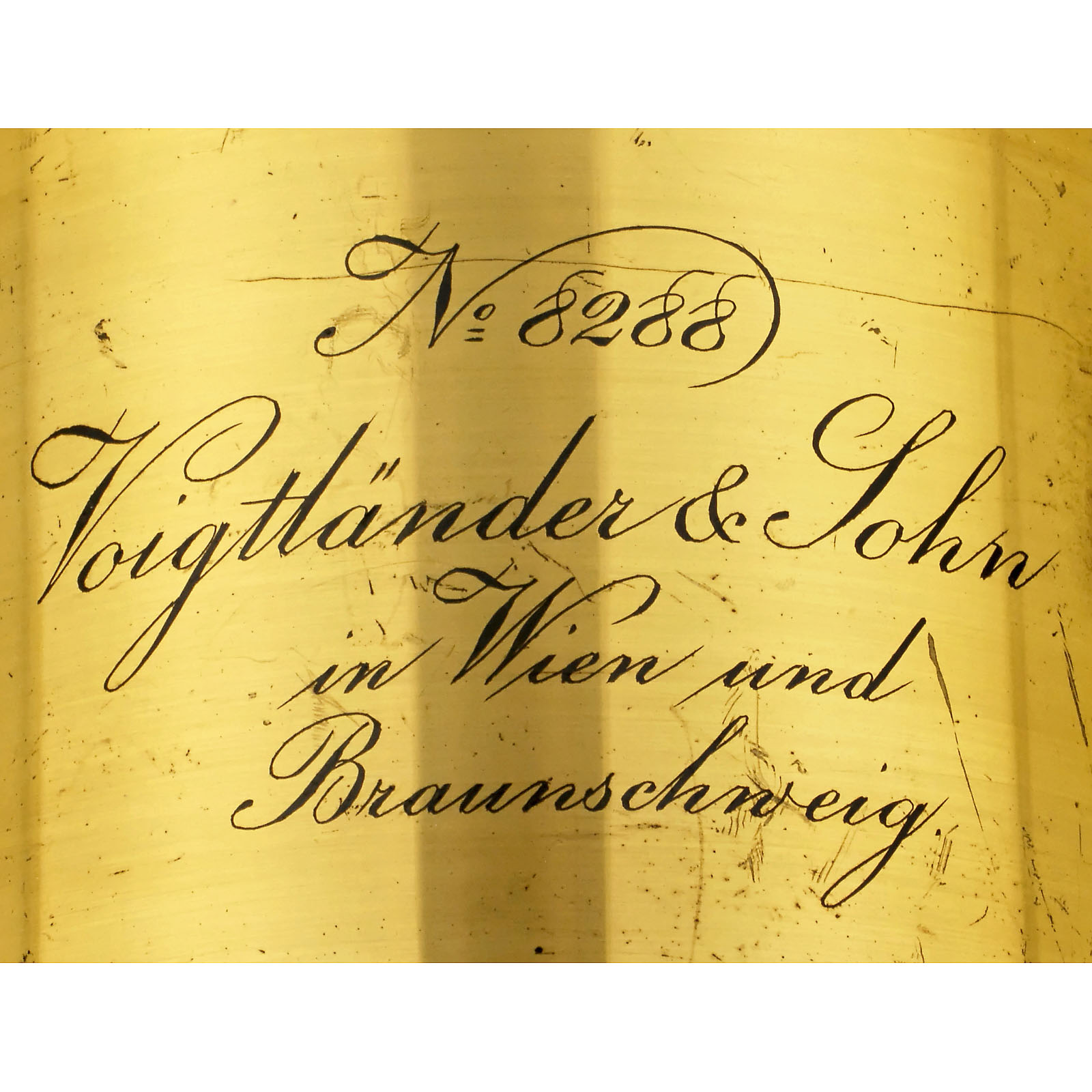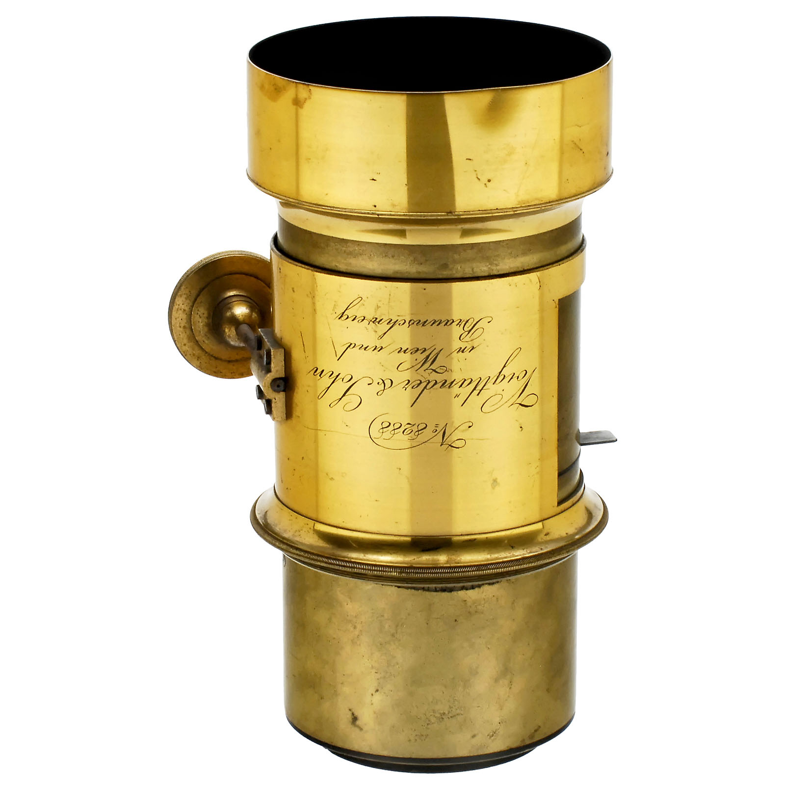 "Voigtländer & Sohn in Wien und Braunschweig". No. 8288, approx. 20 cm focal length, front elements Ø 3 1/6 in., rack-and-pinion focusing (stuck), lens diameter 4 ¾ in., height of the lens (with lens hood) 9 in.