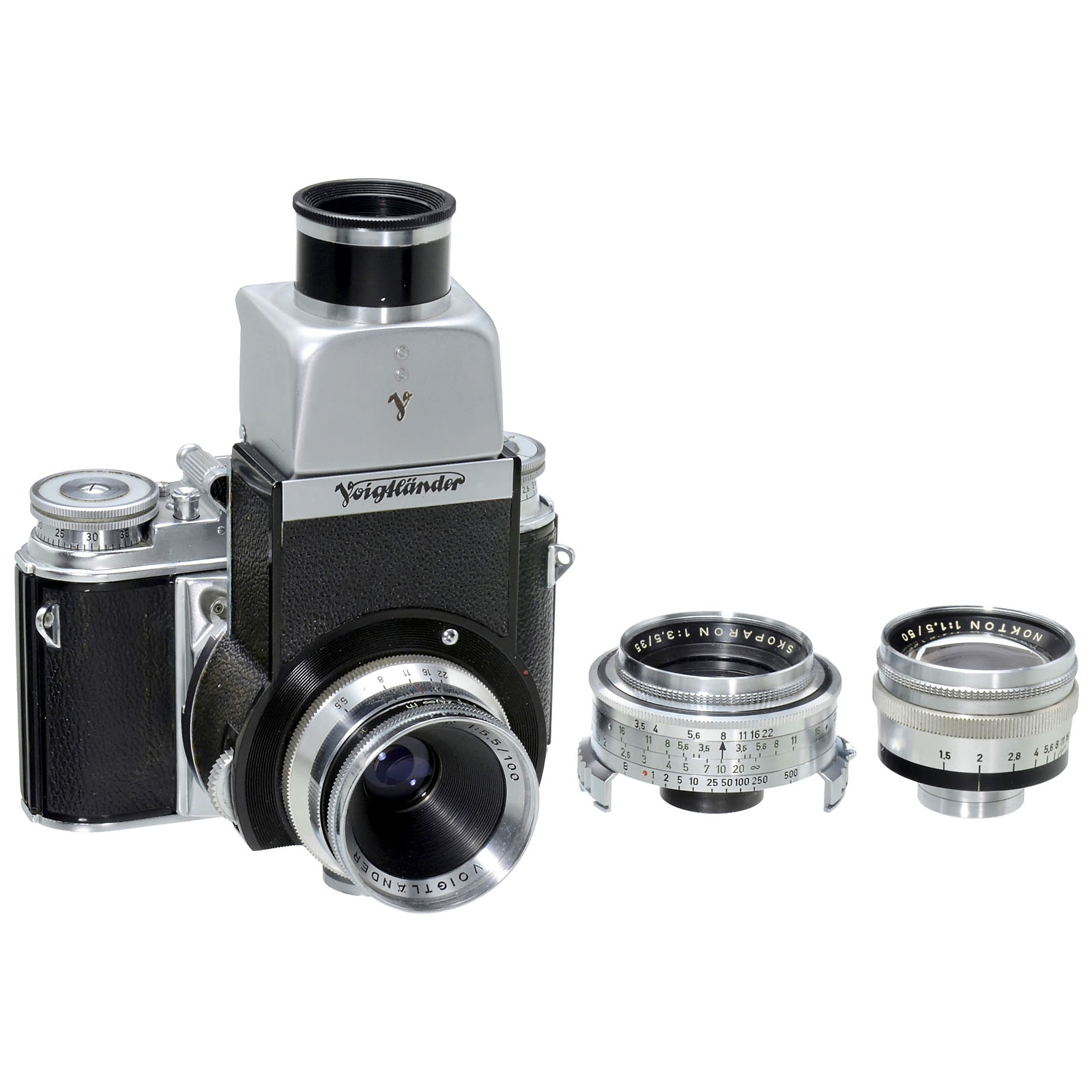 Voigtländer, Braunschweig. 1) Prominent I, second version, no. B 471 87, with Nokton 1,5/50 mm (cement imperfect), no. 3785179, lens cap and maker's case. (2–3/2–3) – 2) Telomar 5,5/100 mm with reflex housing, no. 25535, excellent condition, with original case. (2-/2-) – And: 3) Skoparon 3,5/35 mm, no. 3631448. (3–2/2)
