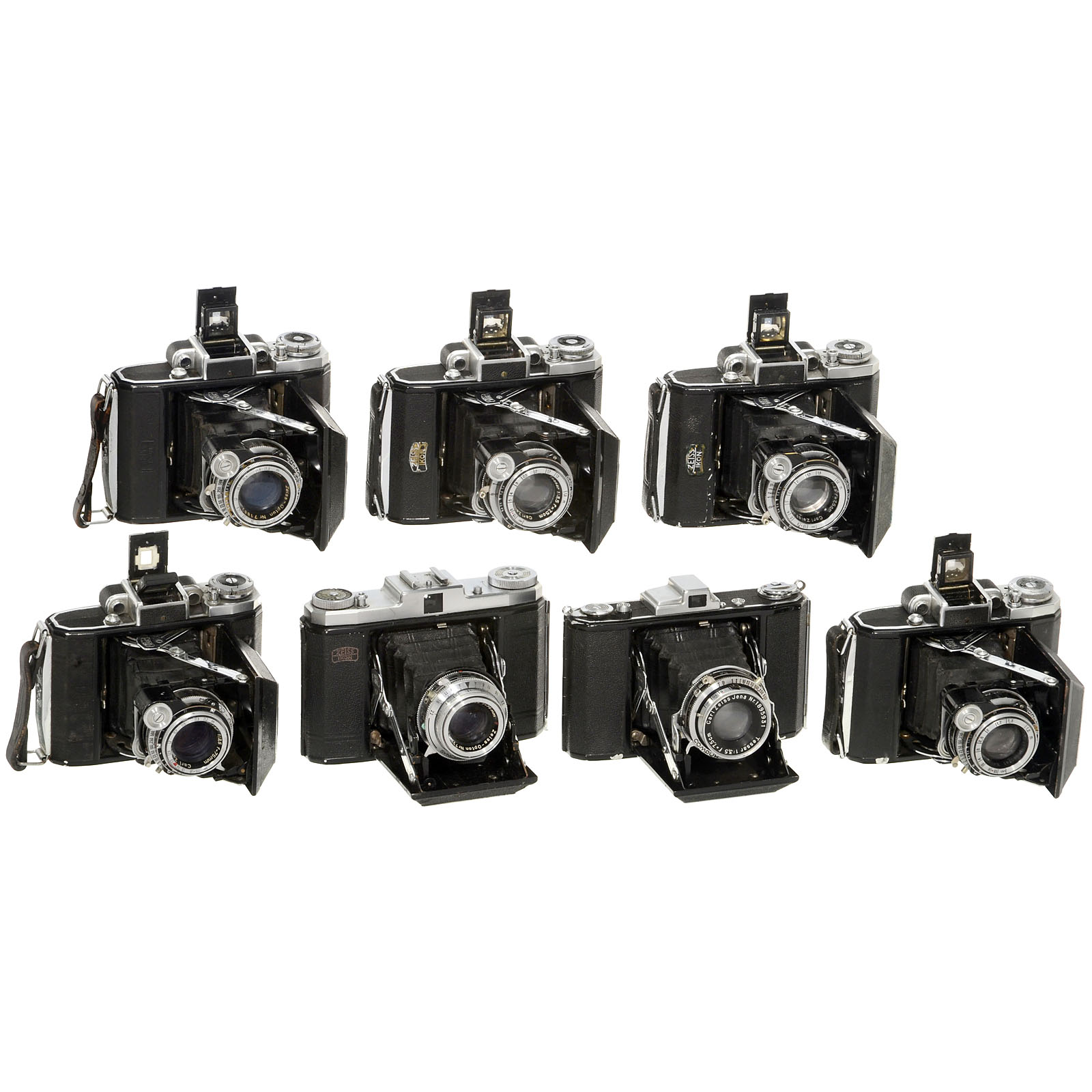 Zeiss Ikon. 5 x type 531 Super Ikonta, pre-war and post-war cameras, with Tessar, Tessar (Zeiss-Opton) and Xenar lenses. Synchro-Compur and Compur-Rapid shutters. Some with signs of heavy use. – In addition: Ikonta 520/16, Tessar 3,5/7,5 cm in Compur-Rapid and Ikonta 523/16, Tessar 3,5/7,5 cm in Synchro-Compur. – Have a look!