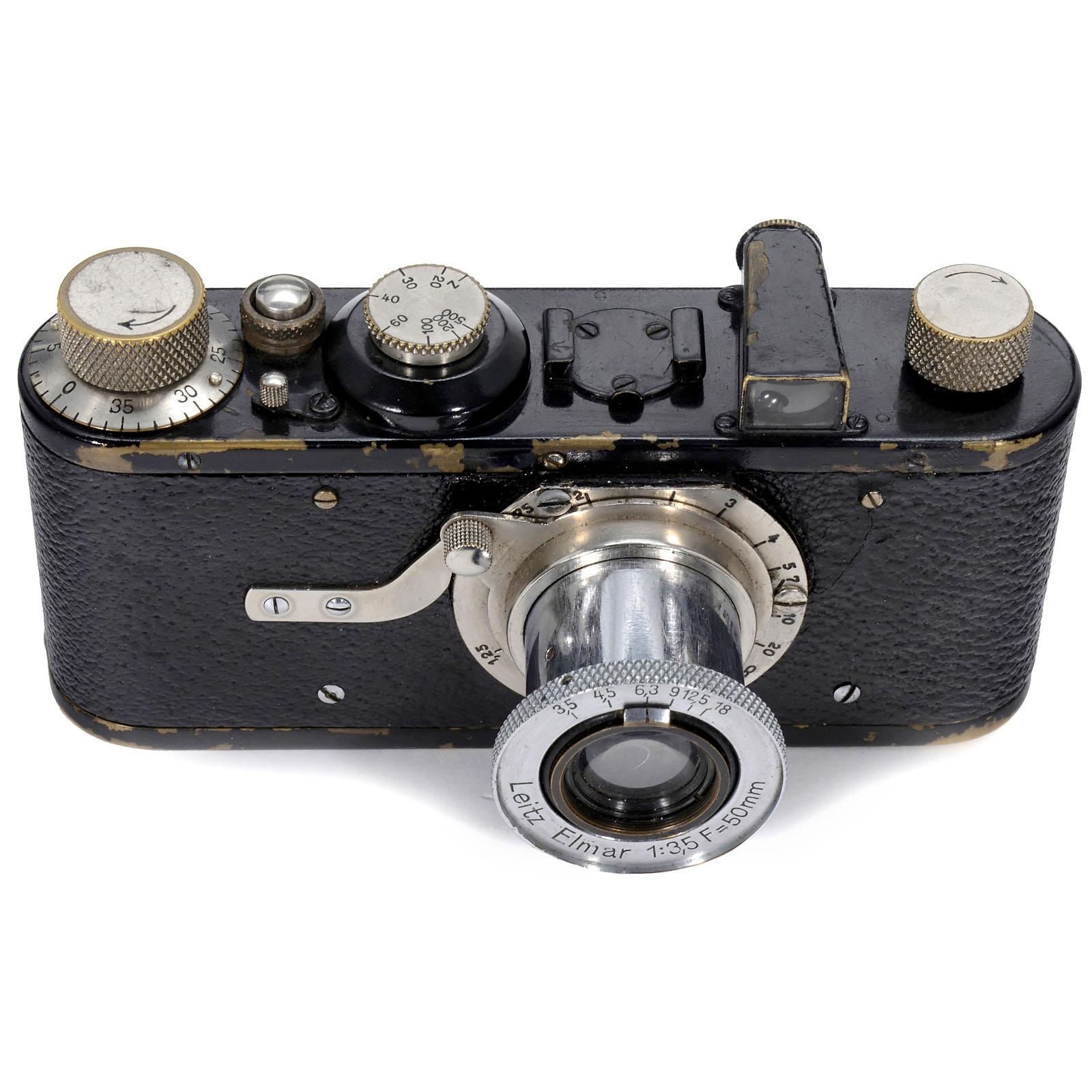 Leitz, Wetzlar. Serial number recoated, screws partly supplemented, vulcanite with cracks, baseplate with dent, Elmar 3,5/50 mm, no. 232450.