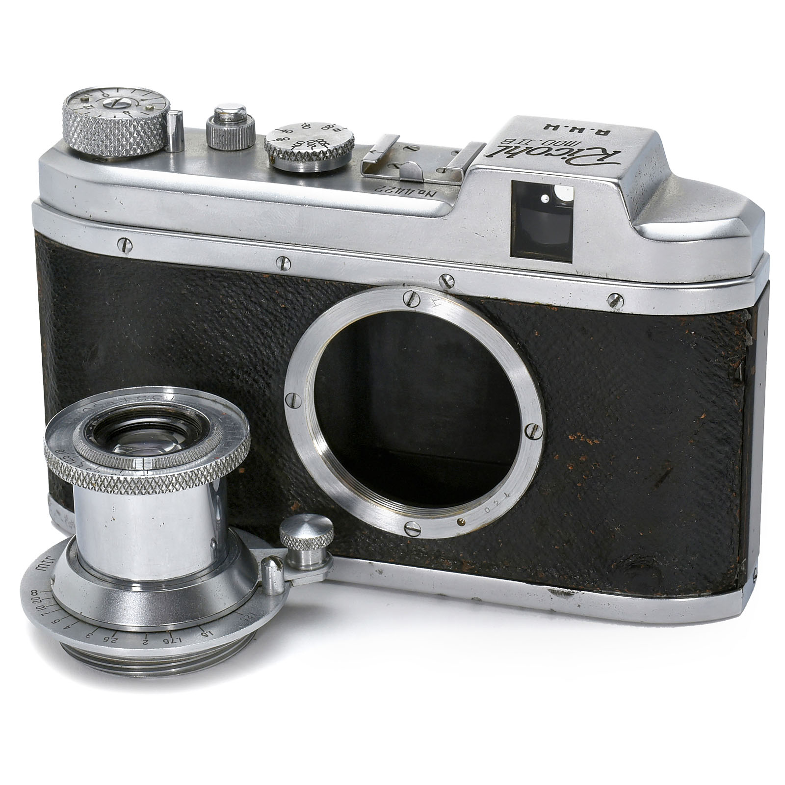 Riken, Japan. No. 4422. Body styled like a 35mm Leica screw-mount camera, but for 3 x 4 cm on type 127 rollfilm, interchangeable lens "Neutar 3,5/50 mm" (Leica style), screw-mount E40 mm, focal plane shutter 1/20–1/500 sec. (working unevenly). – Very rare Leica copy! – Literature: Sugiyama, "The Collector's Guide to Japanese Cameras", no. 3048, p. 50.