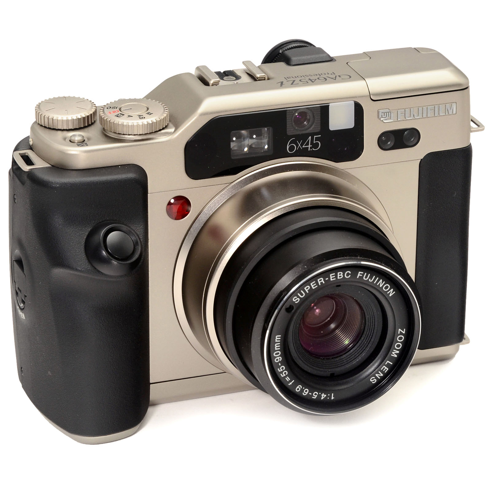 Fujifilm, Japan. Professional rollfilm camera, size 4,5 x 6 cm, with Super-EBC Fujinon Zoom 4,5–6,9/55–90 mm. Shutter and AF working, other functions not tested. With lens cap, soft case and box.