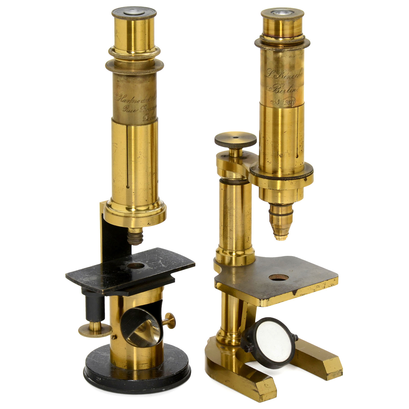 Original lacquer, in fitted mahogany case. 1) Drum-type microscope, signed: "E. Hartnack & A. Prazmowski, Rue Bonaparte 1, Paris", height 9 ¼ in., c. 1875. – And: 2) Berlin microscope, signed: "L. Bénèche, Berlin", no. 2871, height 9 in., c. 1870.