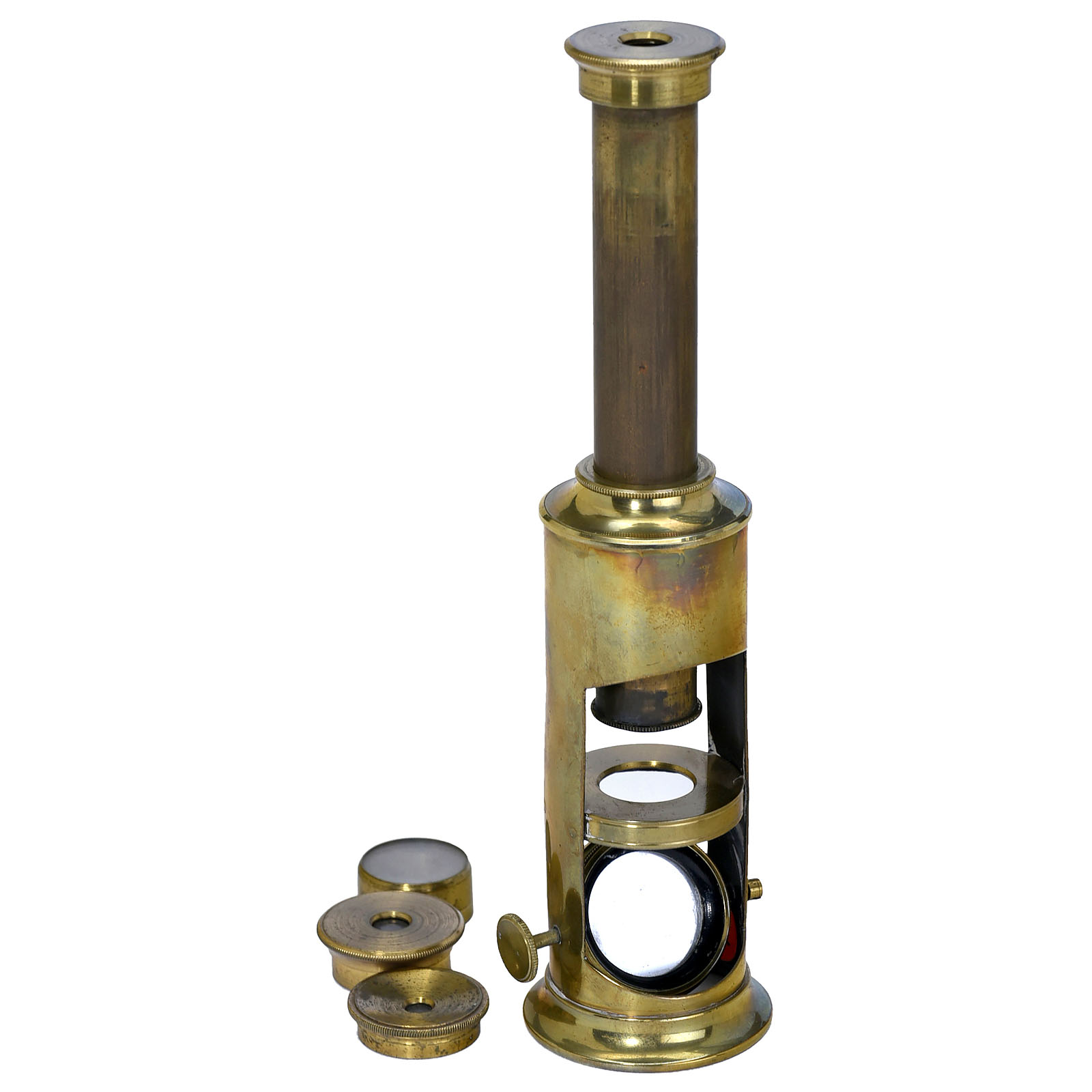 1) A rare optical compendium, comprising a drum-type microscope and a two-draw telescope with original lacquered brass and leather-covered tube, with 2 objectives in leather-covered case, height of the microscope 7 in., extended telescope length 14 in. – And: 2) Compound traveling microscope, unsigned, in the style of Plössl of Vienna, original lacquered brass, rectangular walnut box base, threaded circular pillar, attached plane mirror, stage condenser on folding rod, rack-and-pinion adjustment to the tube, 3 objectives, 1 eyepiece, height 15 in., with live box.