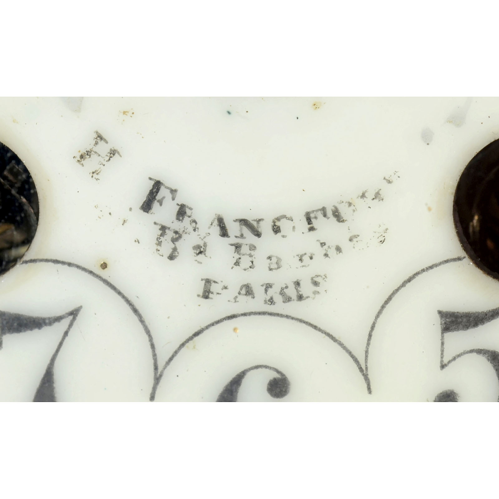Spelter figure signed "Rancoulet" (Erneste Rancoulet, 1870–1915), marble base, 2-train pendulum movement, enameled dial, marked "Boulevard Barbes, Paris" (maker's name illegible), with pendulum and key, overall height 22 7/8 in.