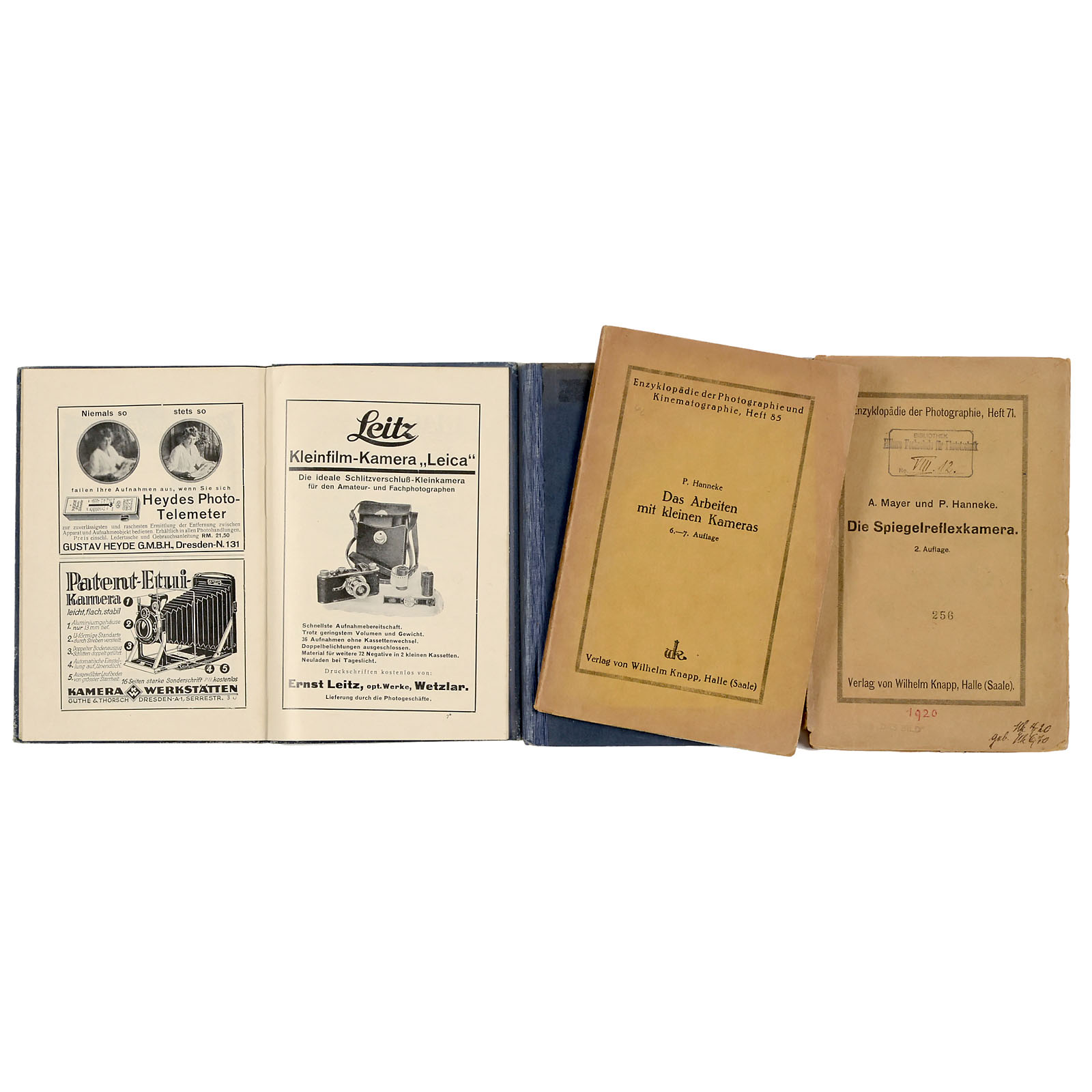 1) Paul Hanneke, Das Arbeiten mit kleinen Kameras, Halle, 1918, 102 pages, plus ads. – 2–3) Ditto, 1928, 88 pages, plus ads (e.g. Leica). – And: 4) A. Mayer and P. Hanneke, Die Spiegelreflexkamera, Halle 1920, 58 pages, plus ads.