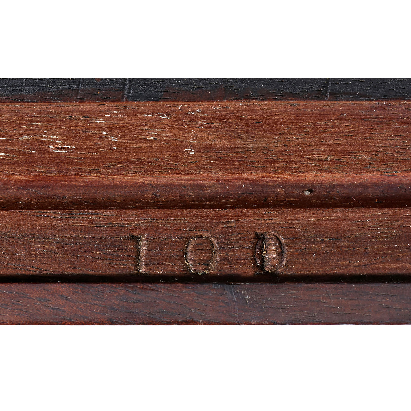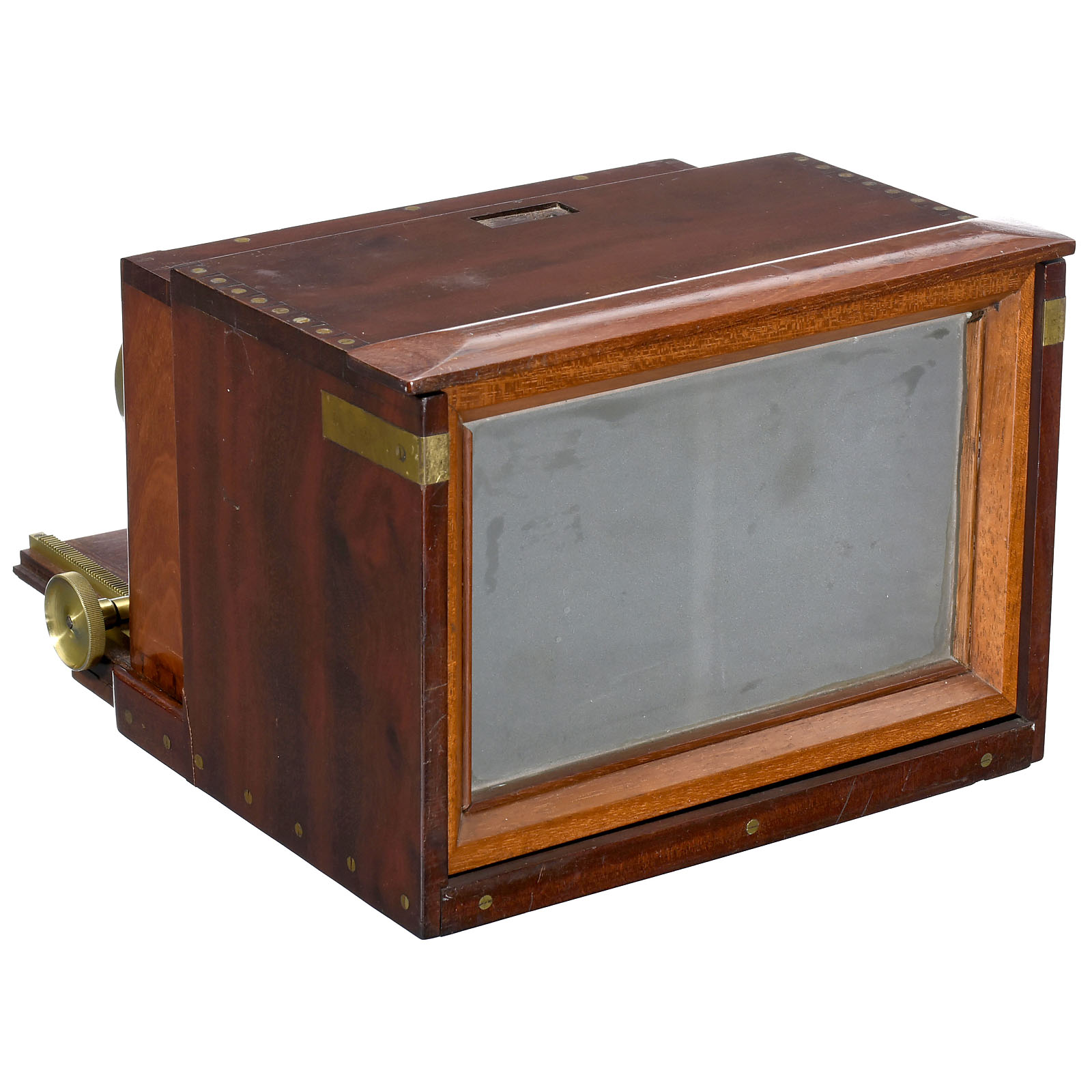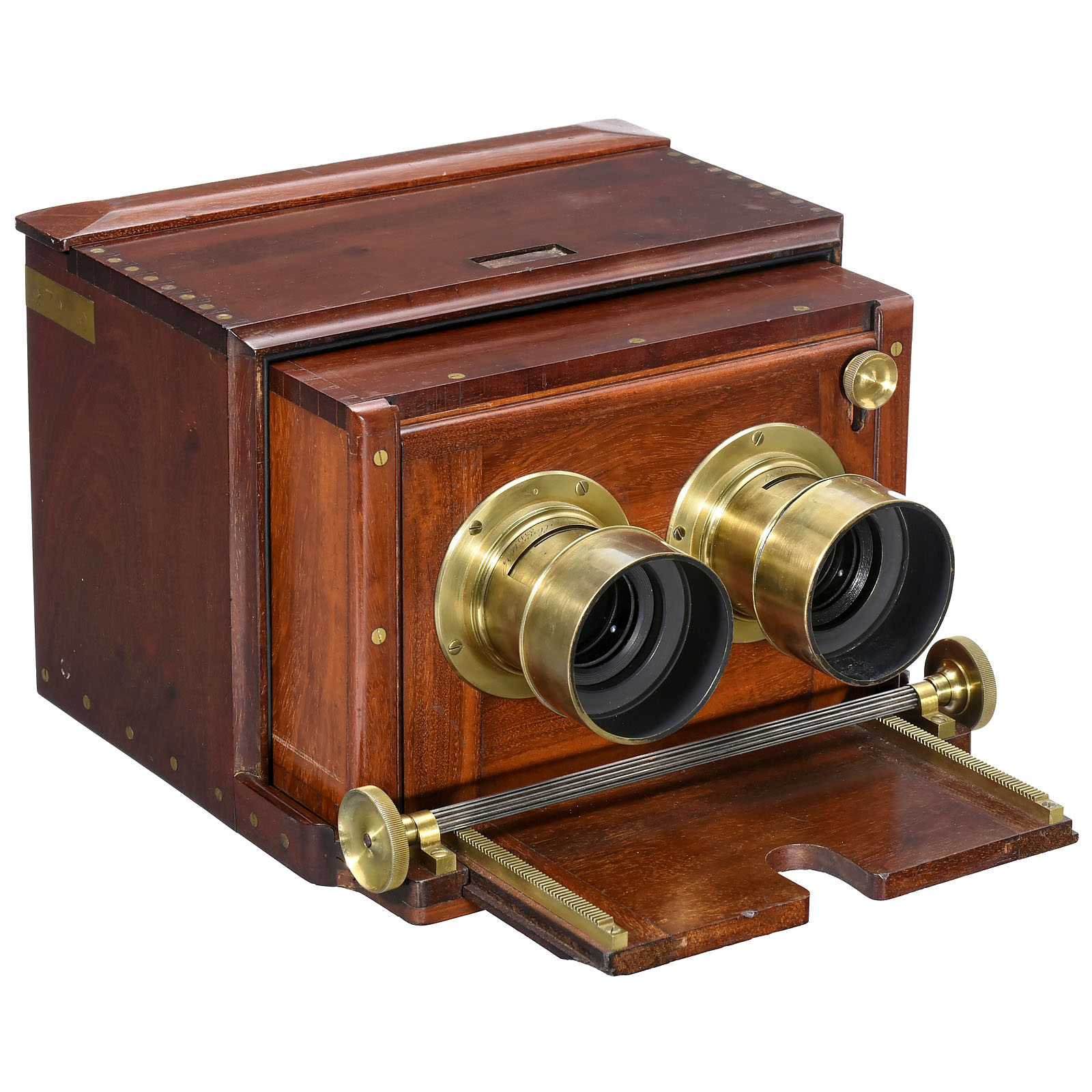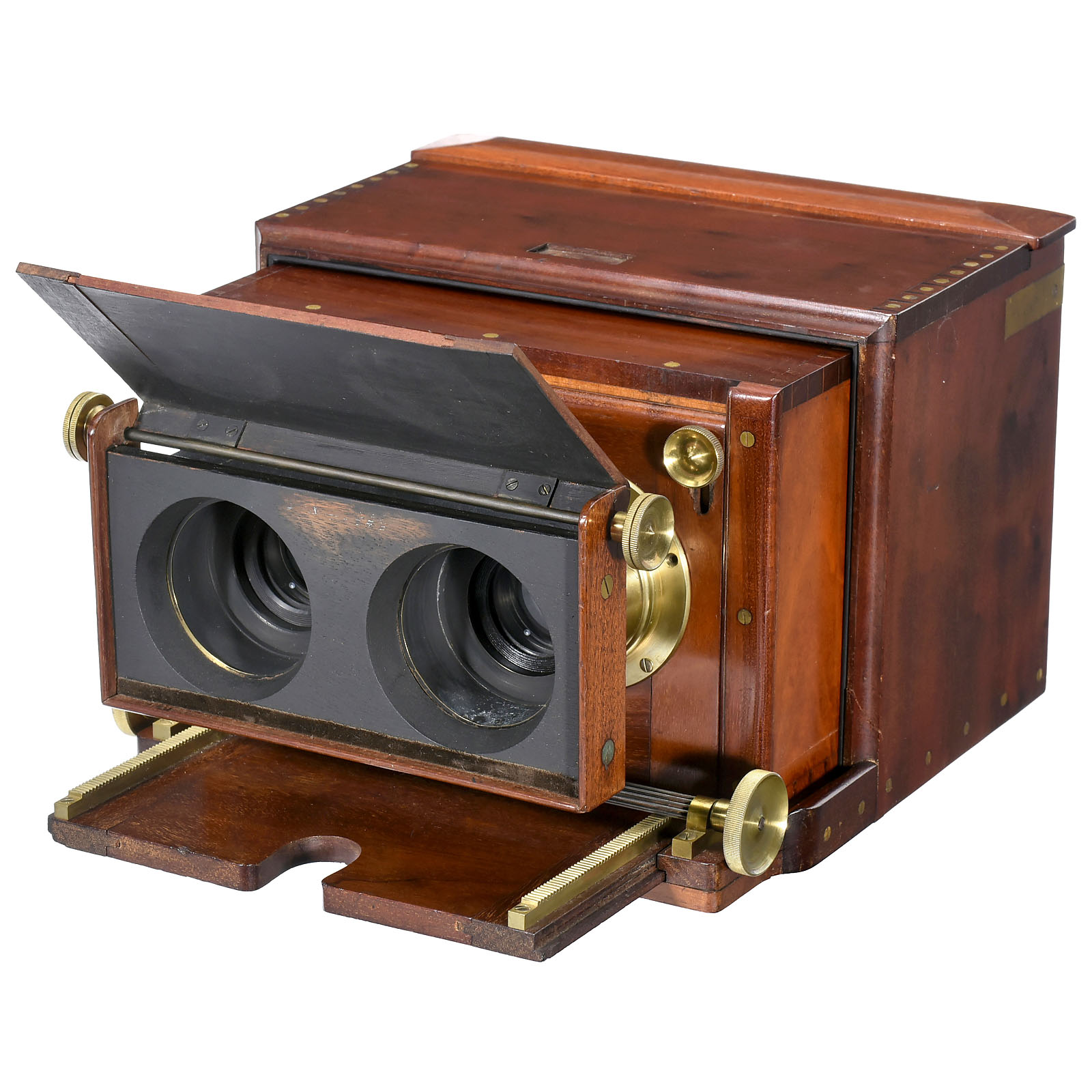 Dallmeyer, London. Very rare stereo wet-plate camera in excellent condition, mahogany body with brass fittings, body no. 100! Focusing screen back 4,35 x 7,05 in., 2 brass landscape lenses by Dallmeyer (no. 3340 + 3341), 12 cm focal length, for waterhouse stop, baseboard with rack-and-pinion focusing, producer shield missing. With rare slide on flip-flap shutter. – A dream of a stereo camera. – Museum piece!