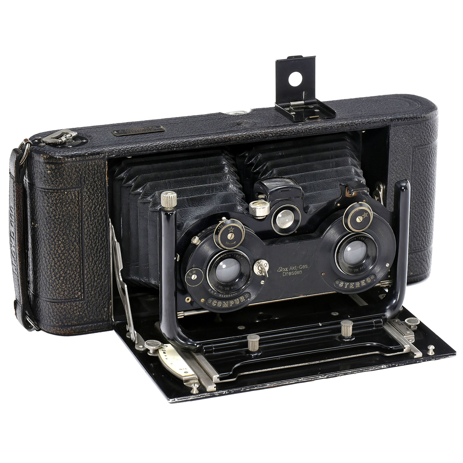 Ica, Dresden. For plates and rollfilm, 9 x 18 cm (2 x 9 x 9 cm), 2 x Ica Doppel-Anastigmat "Hekla" 6,8/12 cm, Compur-Stereo. – Excellent condition!
