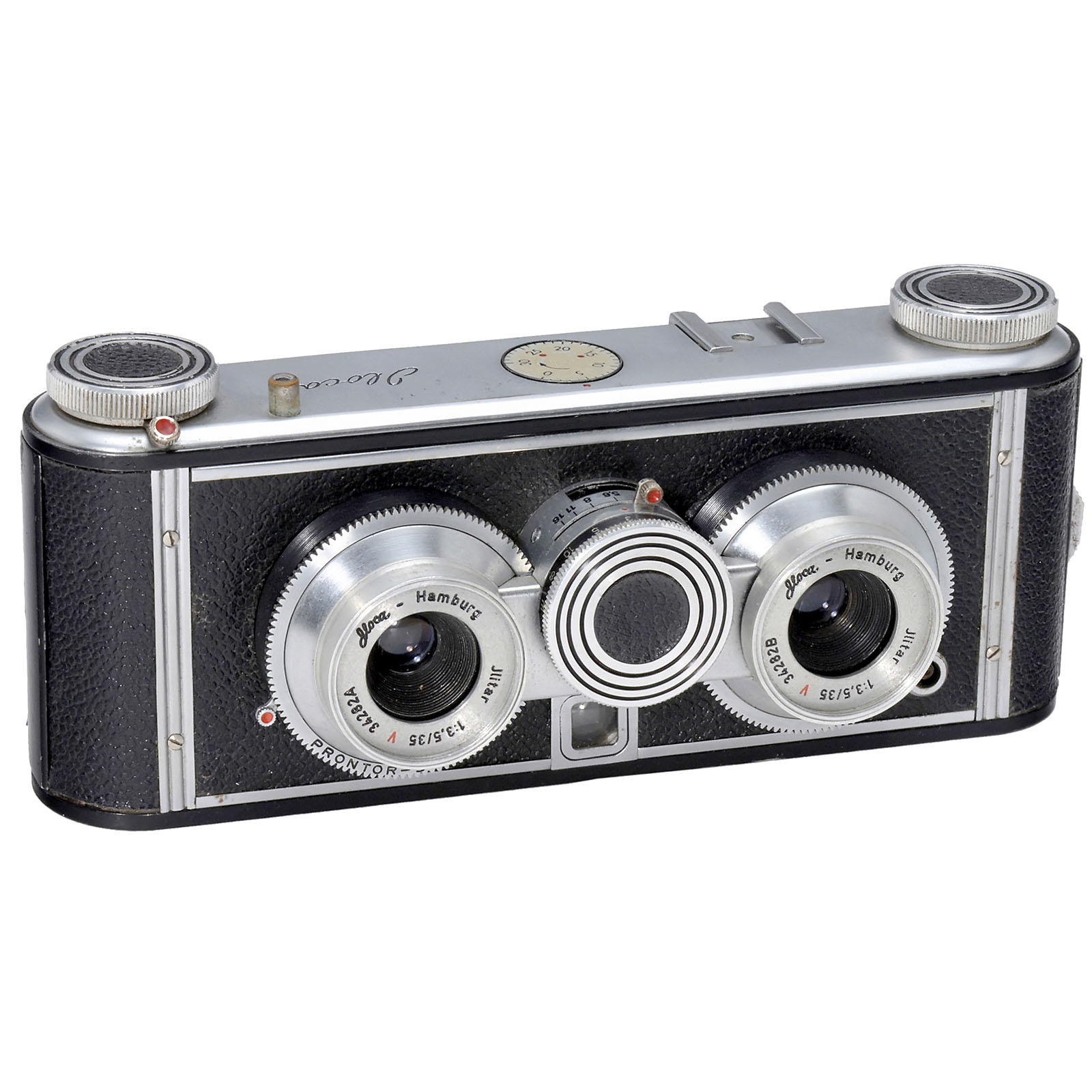 Wilhelm Witt, Hamburg. Stereo camera for 35 mm film, image size 24 x 23 mm, lenses: Ilitar 3,5/35 mm, shutter: Prontor S, B, 1–1/300 sec. (does not work), with every-ready carrying case.