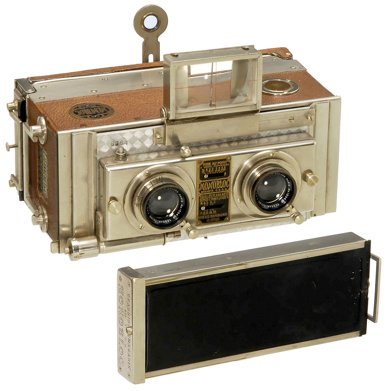Jeanneret & Cie, Paris. Luxury version of Monobloc camera, nickel fittings, body covered with brown morocco leather. For 6 x 13 cm stereo or panoramic exposures, magazine back. Krauss Zeiss Tessar 4,5/8,5 cm lenses, pneumatic shutter. In near mint condition and extremely rare!