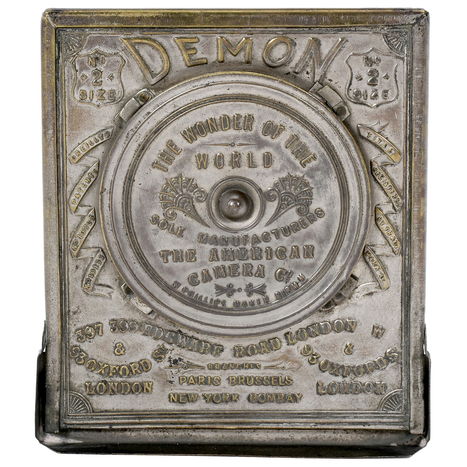 The American Camera Co., 397–399 Edgware Road, London. Rare version with plate size 3 ¾ x 3 ¾ in., single round exposures, plate flap missing, nickel-silver body, the striking design of the back stamping (by W. Phillips) makes the back view more interesting than the front view of these cameras. – Literature: "McKeown's Price Guide", 12th edition, p. 50, and Michael Pritchard, "Spy Cameras", p. 21.