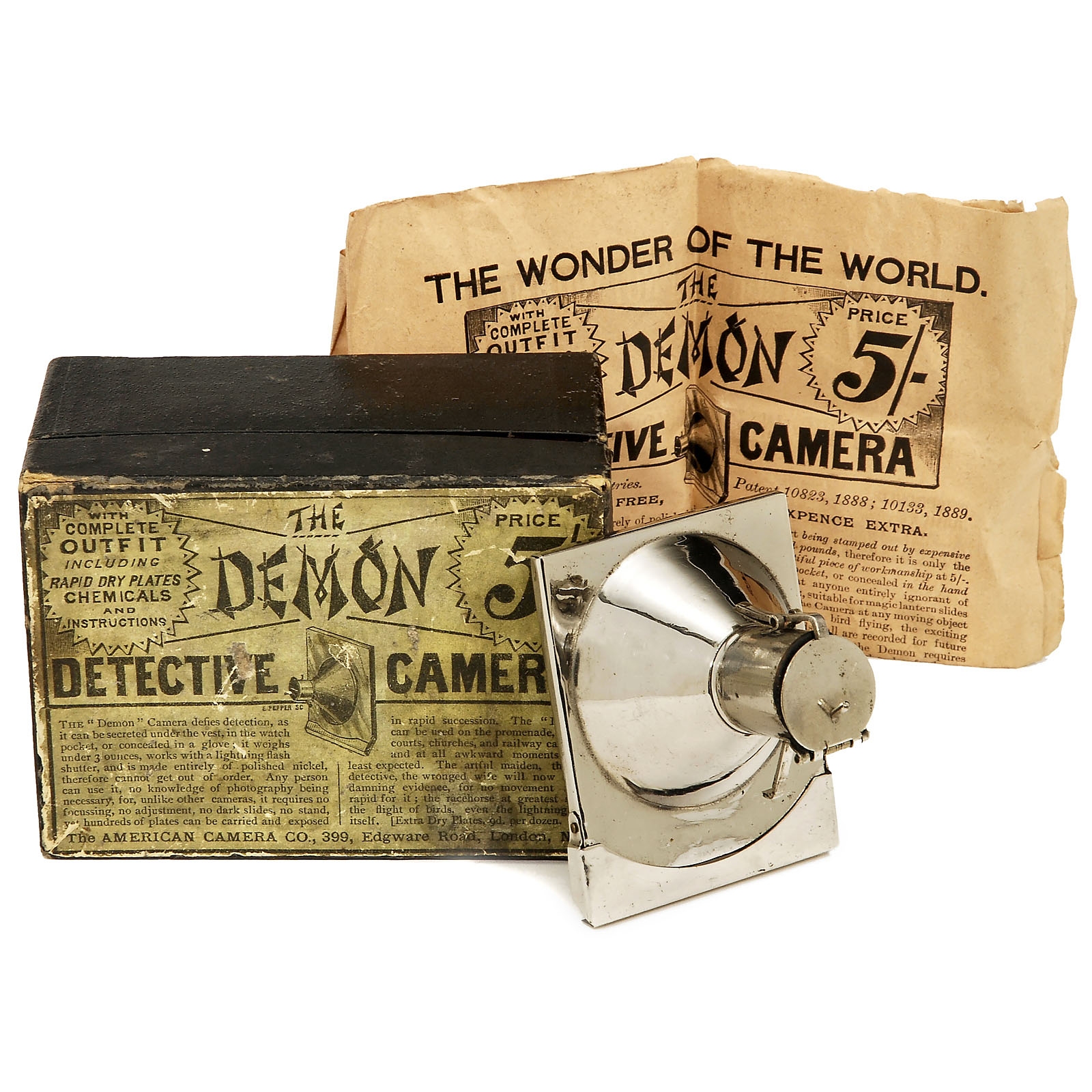 The American Camera Co., 397–399 Edgware Road, London. Originally introduced in 1889 for 2 ¼ in. diameter photos on plates of 2 1/3 x 2 1/3 in., single round exposures. The striking design of the back stamping (by W. Phillips) makes the back view more interesting than the front view of these cameras. With extremely rare original box and brochure! Unrestored original condition! – Literature: McKeown's Price Guide 2005/06, p. 50, and Michel Auer, "Kameras gestern und heute", p. 91.
