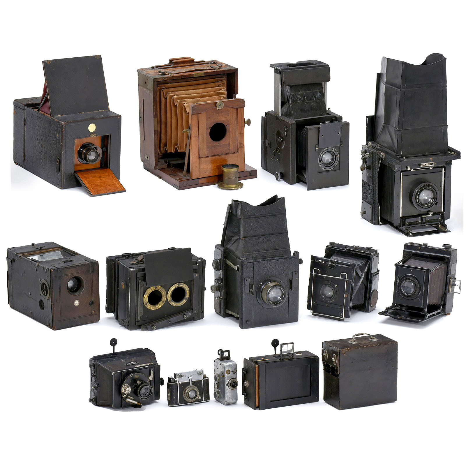 Stereo camera, SLR camera, plate camera, strut camera, magazine camera, rollfilm camera, field camera. – All cameras imperfect or spare parts. – Have a look!