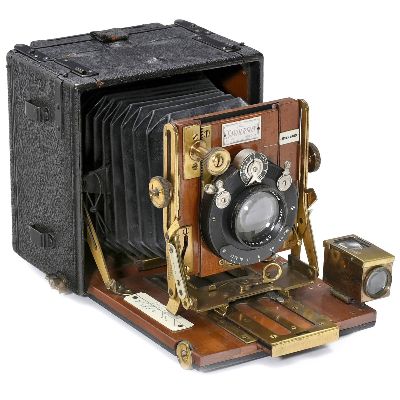 Houghtons Ltd London for Sanderson Ltd London. Plate size 3 ¼ x 4 ¼ in., Ross 6 in. Xpress 4,5 in ACME shutter, black leather covering, leather-covered wood body, polished wood interior with brass fittings, focusing screen back. Classic camera by Sanderson.