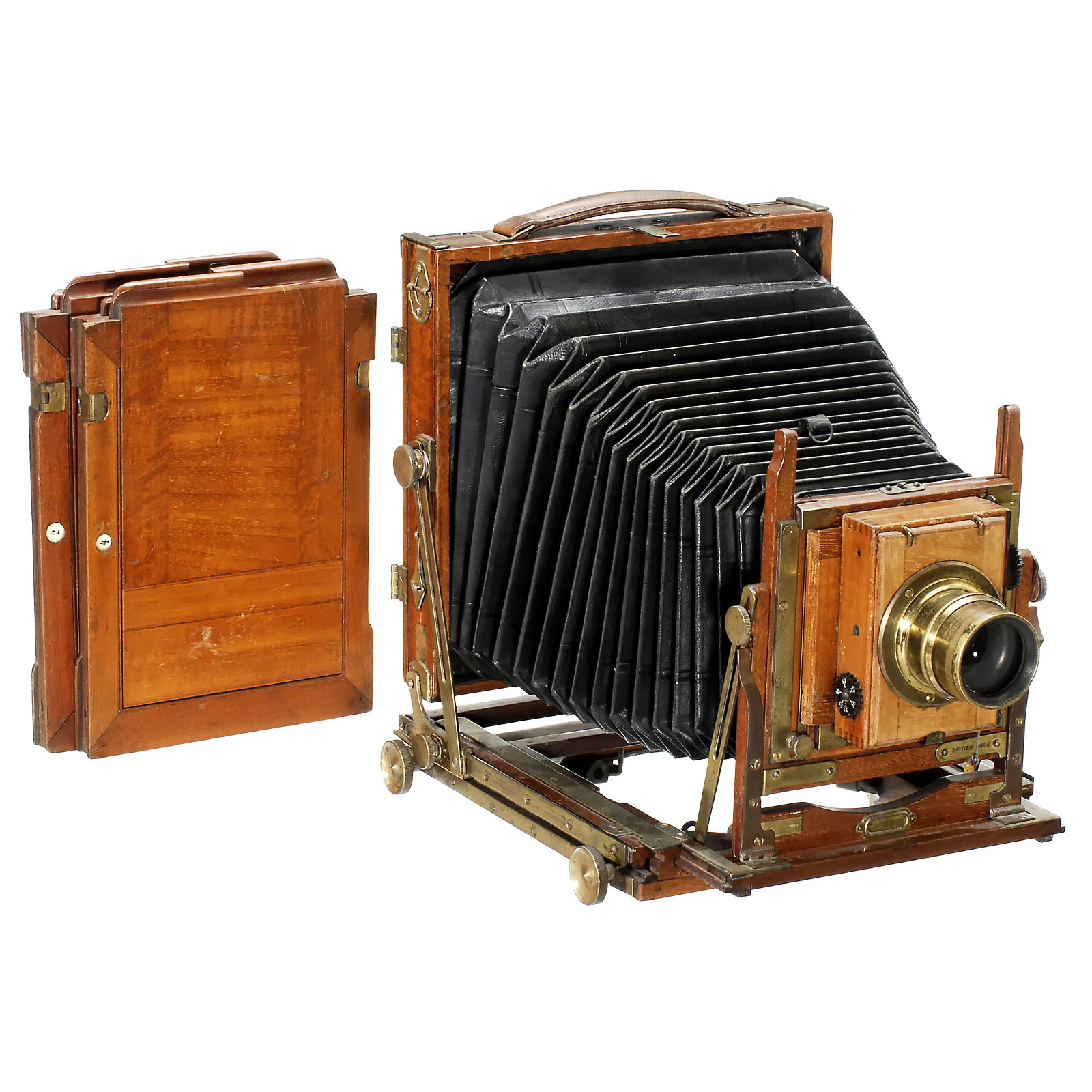 Houghton & Sons, London. Plate size 4,75 x 6,5 in., mahogany body with brass fittings, black bellows, lens: "Sold by John Piggott, 117 Cheapside, London, No. 342", with iris stop, roller-blind shutter (1/15–1/90 sec.), working. With focusing screen back and 2 wooden double cassettes. – Excellent condition!