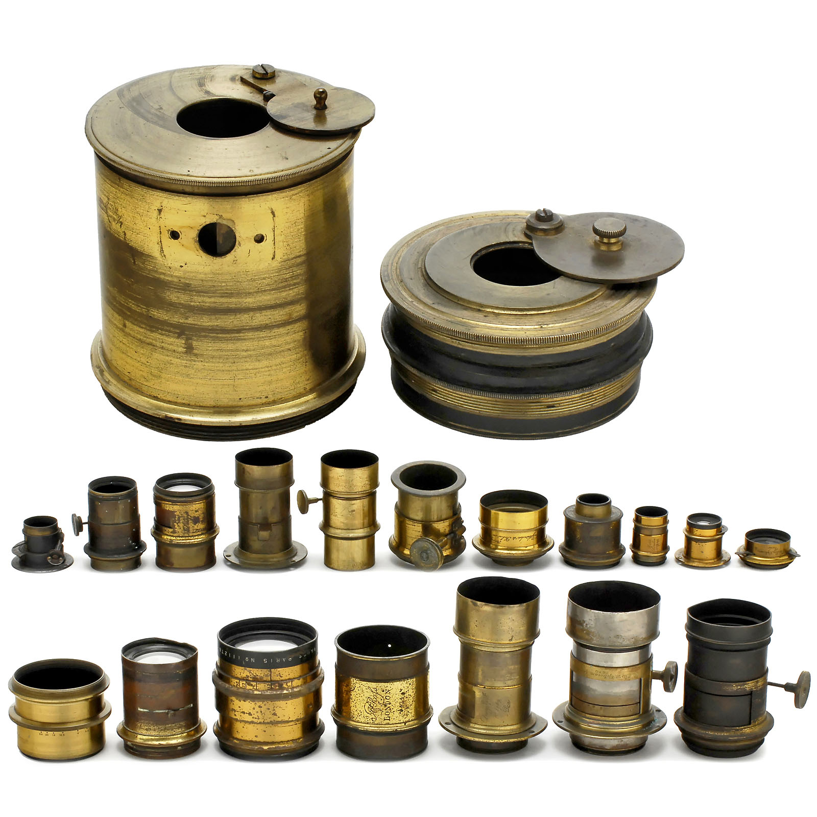 Some optical elements or rack and pinion missing, dented and in poor condition. Some lenses with manufacturer's engravings: Bulmer, Burr, Busch, Darlot, Derogy, Fleming, Krauss, Marion & Co., Richebourg, Ross and Voigtländer. – Valuable lot for restorers. Worth inspection!