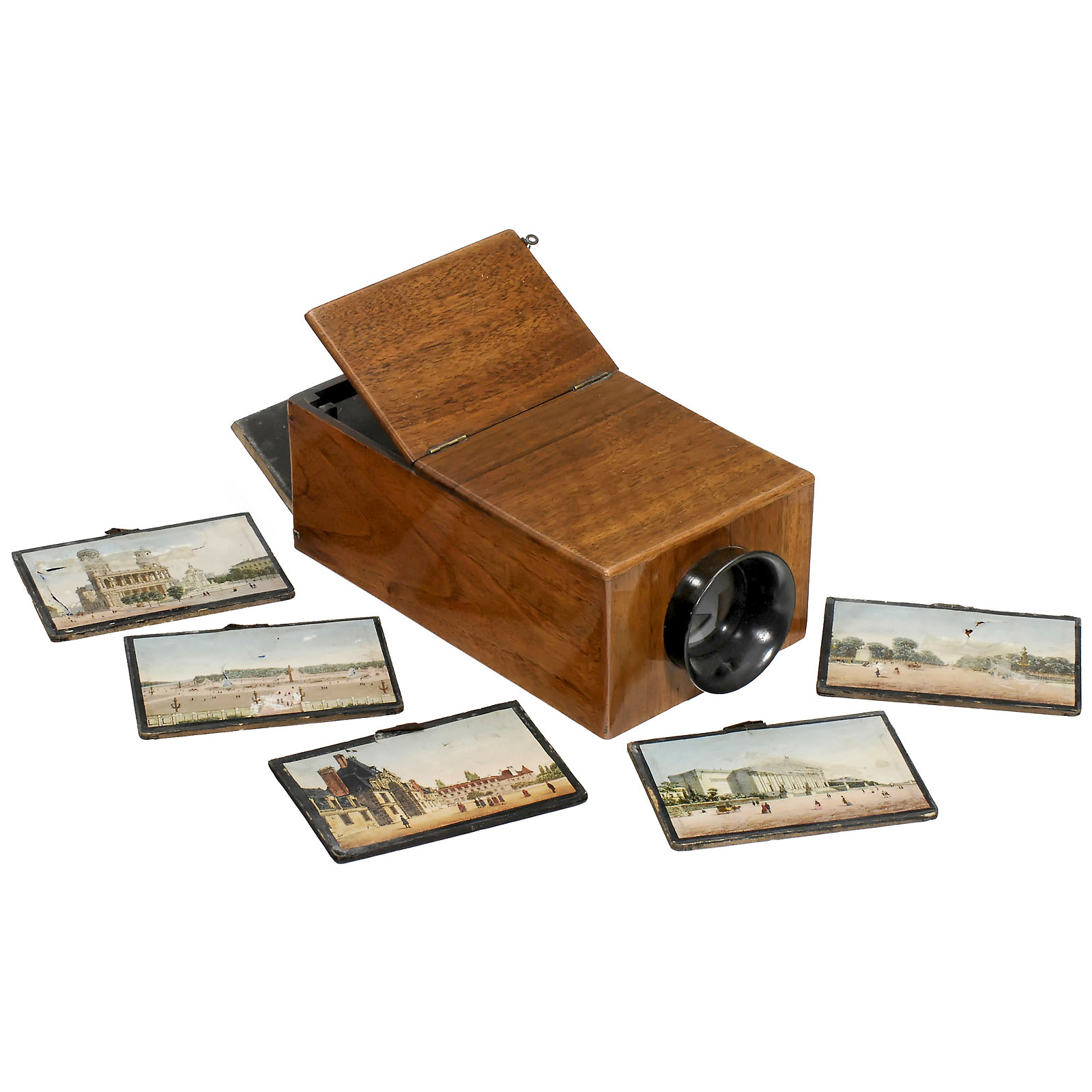 France. Polyorama-type viewer for 4 x 5,5 in., day/night and metamorphic images, with polished wood body, 2,35 in. diameter simple lens in turned mount, hinged backflap and lid (missing mirror), 11,8 x 6,3 x 4,33 in. With 5 French tinted views (some damaged).