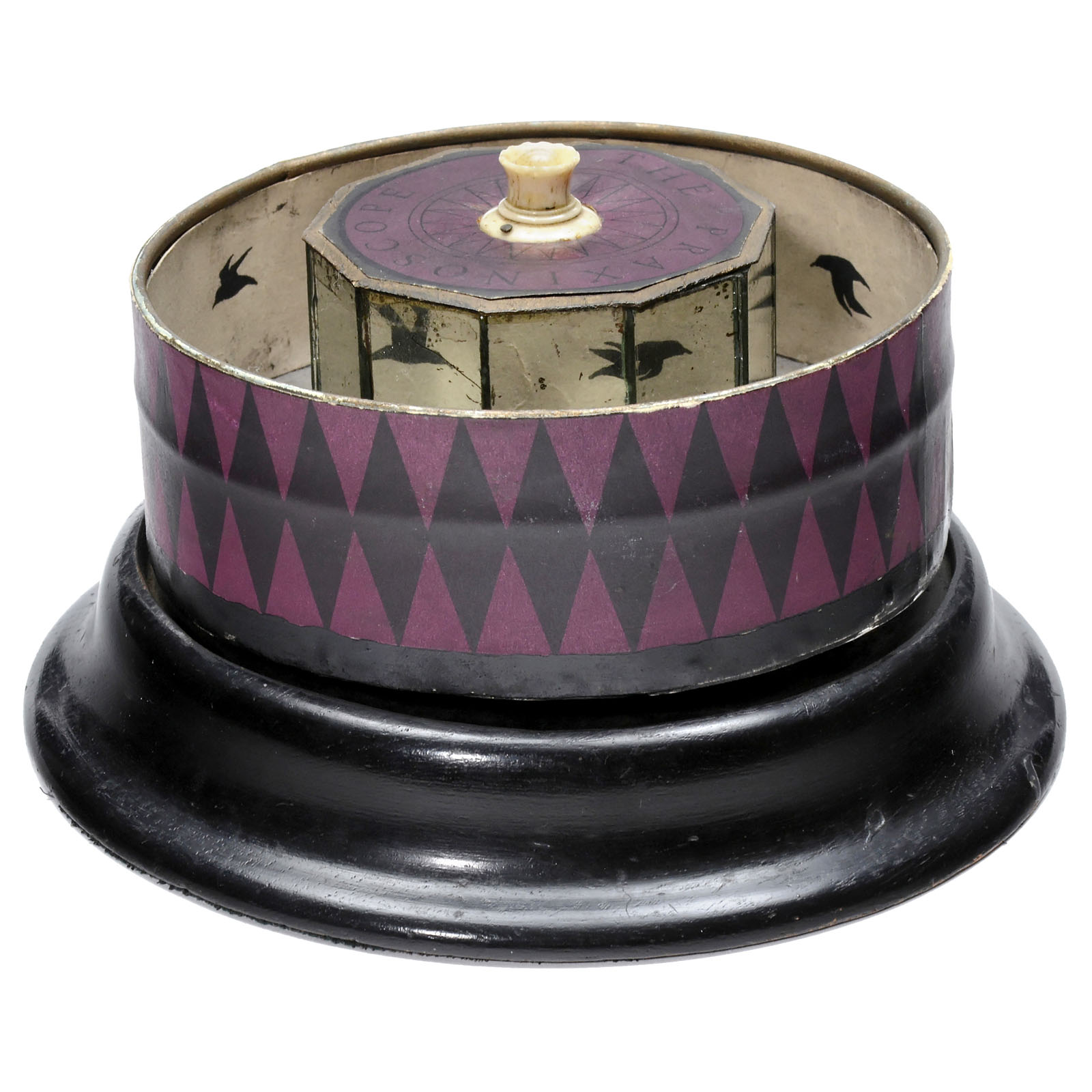 Rare English "Praxinoscope", cylinder diameter 5,5 in.! 10 mirrors 20 x 45 mm (0,78 x 1,75 in.), wooden base, decorative reel, height 4,75 in., with one stripe "bird fly".