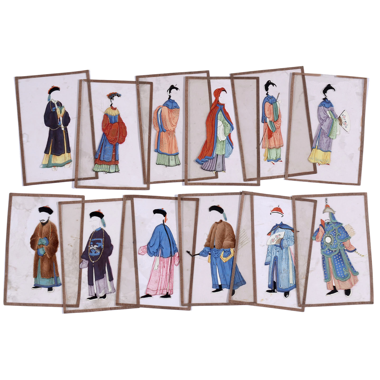 Comprising a pair of male and female watercolor portraits and twelve finely hand-painted mica overlays, six for each sex, with variations in costume, occupation (including archer and warrior) and hairstyle, in silk-covered cases originally joined together by a ribbon, overlays approx. 2 5/8 x 3 7/8 in. (6,7 x 10 cm). Good overall condition, case missing ribbon, bright colors. Note: "Changements Inattendus", metamorphic or protean transformation sets are examples of early optical toys which demanded an act of interpretation, a way of looking that searched for hidden images in every-day items. "Understanding such ways of seeing – the modes of human perception – opened the way to the 'philosophical toy', devices that played with the vagaries of visual capacity and conjured images". (Quoted from Marina Warner in "Eyes, Lies and Illusions".) – There are several varieties of metamorphic toys: male and female figures, full and half-length portraits on paper and bone, overlays on paper and mica. The earliest recorded transformation toys in mica, a sheet silicate mineral, date from the mid-17th century. The Royal Collection of Great Britain possesses an early mica transformation set believed to represent Queen Henrietta Maria, the wife of Charles I. In March 2011 Auction Team Breker sold a similar set depicting Queen Christina of Sweden. Due to the fragile nature of mica, few European transformation sets – and even fewer from Asia – are known to have survived. A rare and fascinating optical toy. – Literature: https://www.royalcollection.org.uk/collection/422348/set-of-mica-overlays-and-miniature-of-henrietta-maria-1609-1669; Auction Team Breker, 26 March 2011, Lot 407; Laurent Mannoni et al., "Eyes, Lies and Illusions", exhibition catalogue (2004), pp. 113, 218–19.