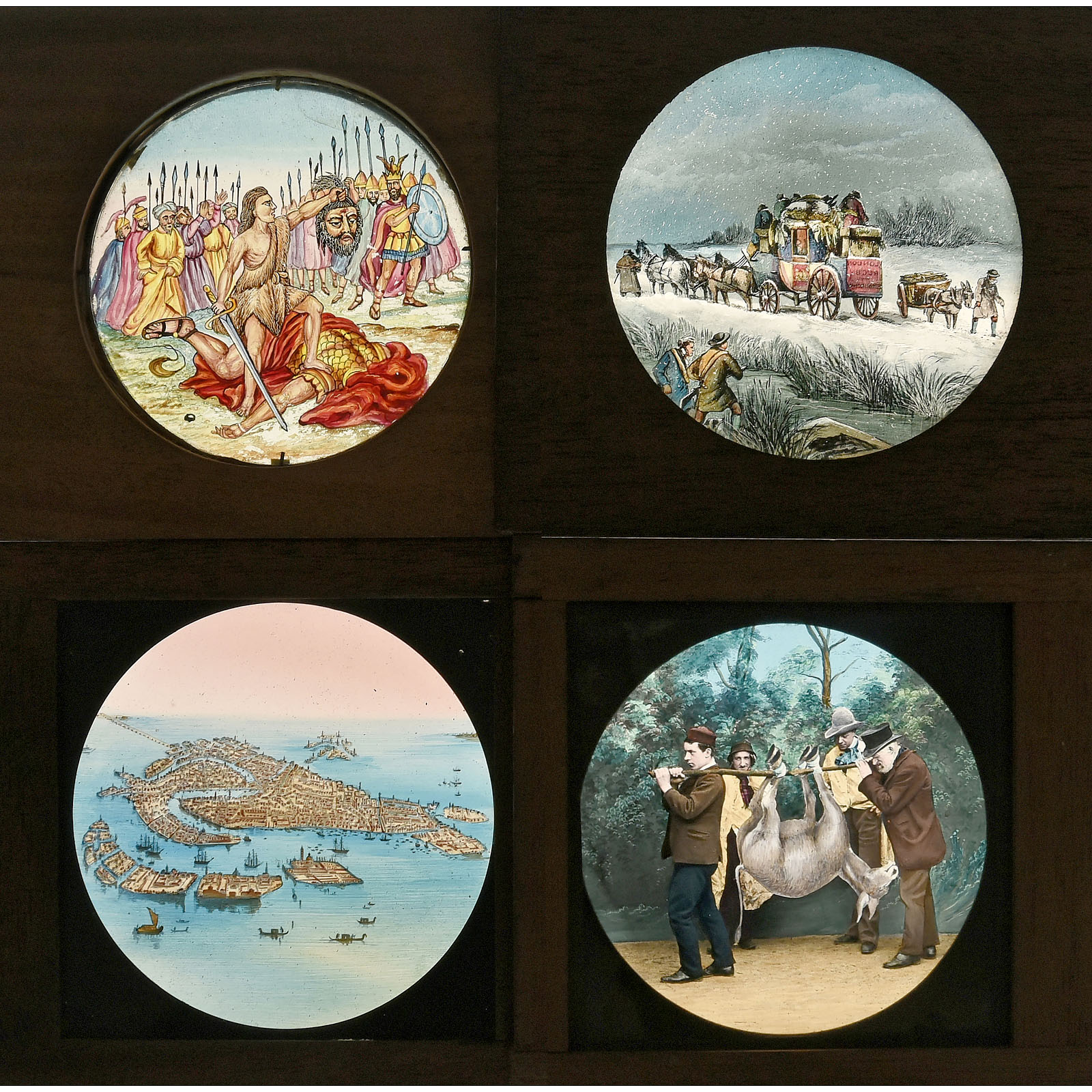 Diverse groups, including hand-painted scene of "David and Goliath", hand-colored photographic slide "He Who Would Please Everybody Will Lose His Donkey", No. 5 in series of John Ploughman's Pictures printed by Newton & Co., 3 Fleet St., London; 3 Masonic slides (2 "Knights of Pythias 3rd Rank"); and 12 slides from the "Drunkard's Progress" series, (two cracked, one image rubbed off). – In addition: 5 related booklets, including "List of Slides Used in Secret Societies" by Chas. M. Stebbins Picture Co., 1028 Main St., Kansas City, Missouri.