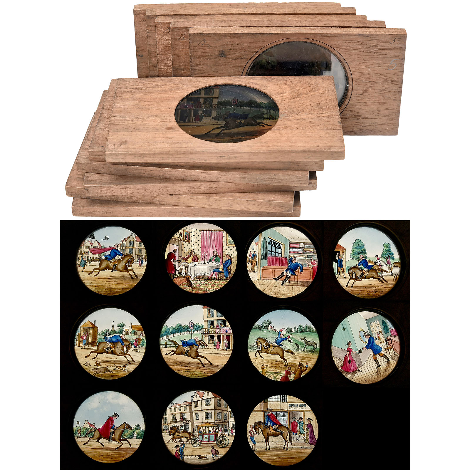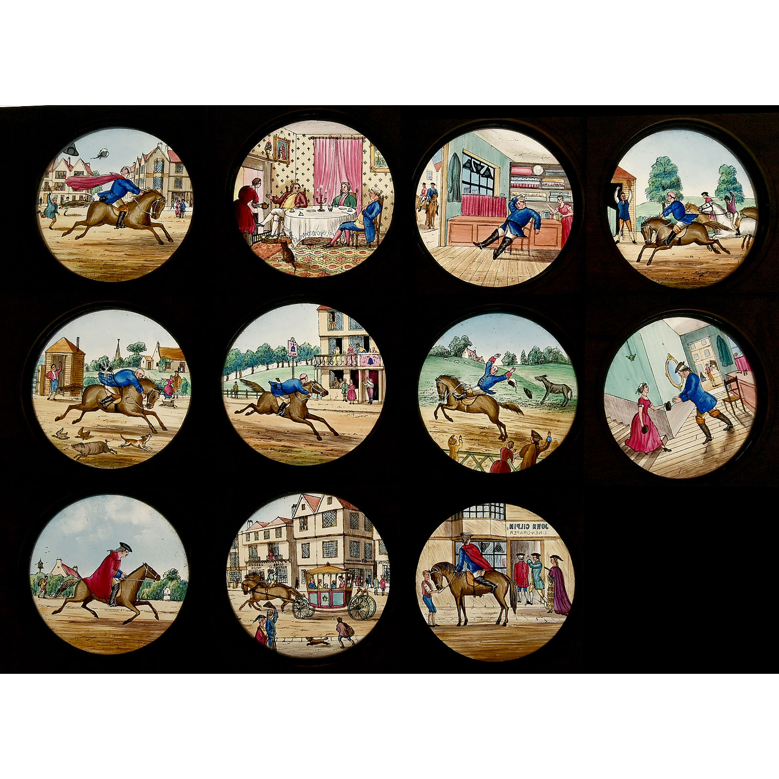 4 x 7 in. (10 x 17,5 cm), part-set of hand-colored slides (missing nos. 8 and 13) based on William Cowper's poem "The Diverting History of John Gilpin".