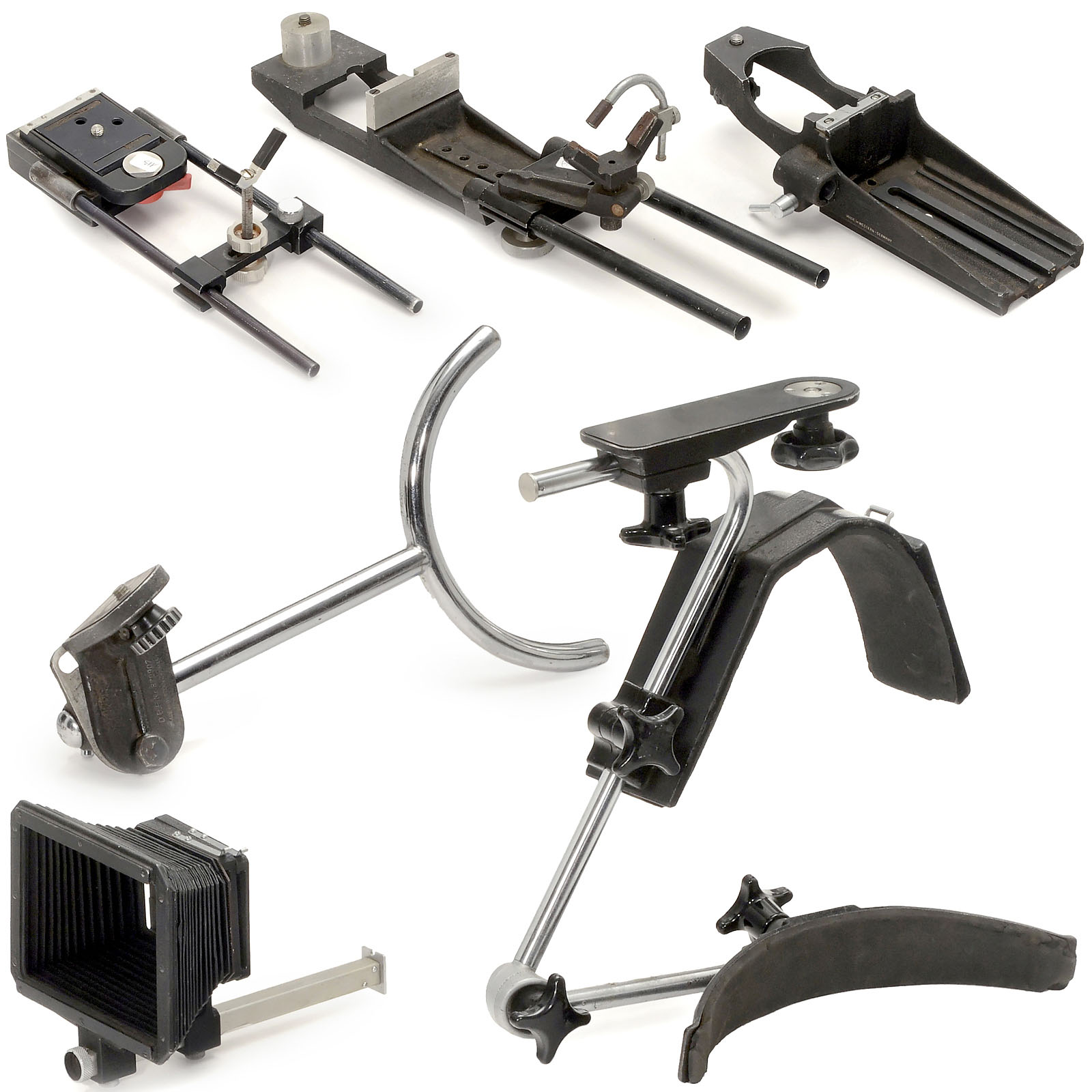 Arnold & Richter, Munich. 3 mounting brackets for tele lenses, 2 shoulder tripods, 1 compendium for Arriflex 16 St.