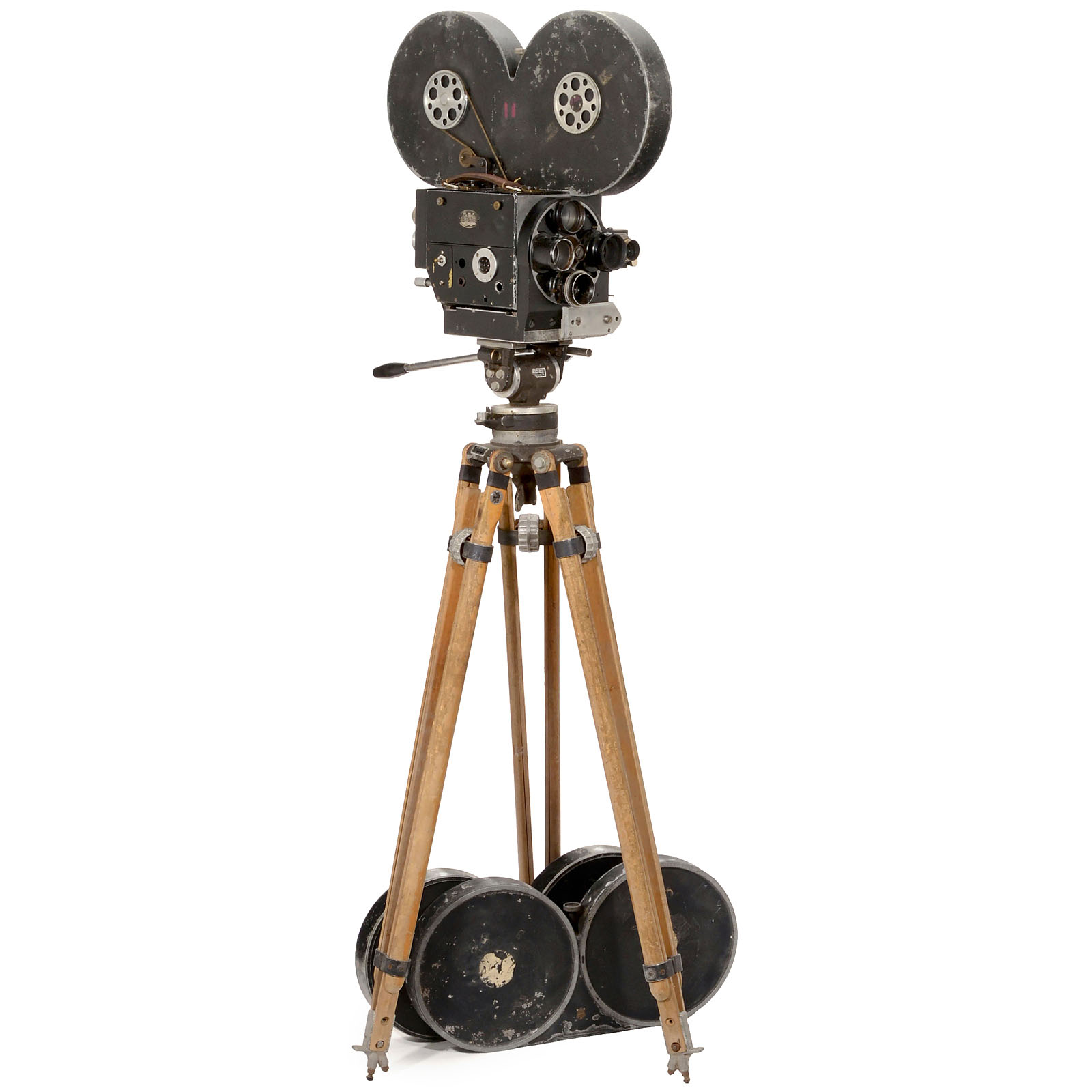 By Wall Co., Syracuse, USA. For 300 m Bell & Howell magazines, 4-lens turret, with Zeiss Tessar 1:2,7/40 mm and Kinoptik 1:2/35 mm lenses, ground-glass viewfinder, electric motor drive (untested). – In addition: Three 300m magazines, Miller tripod and 2 original suitcases.