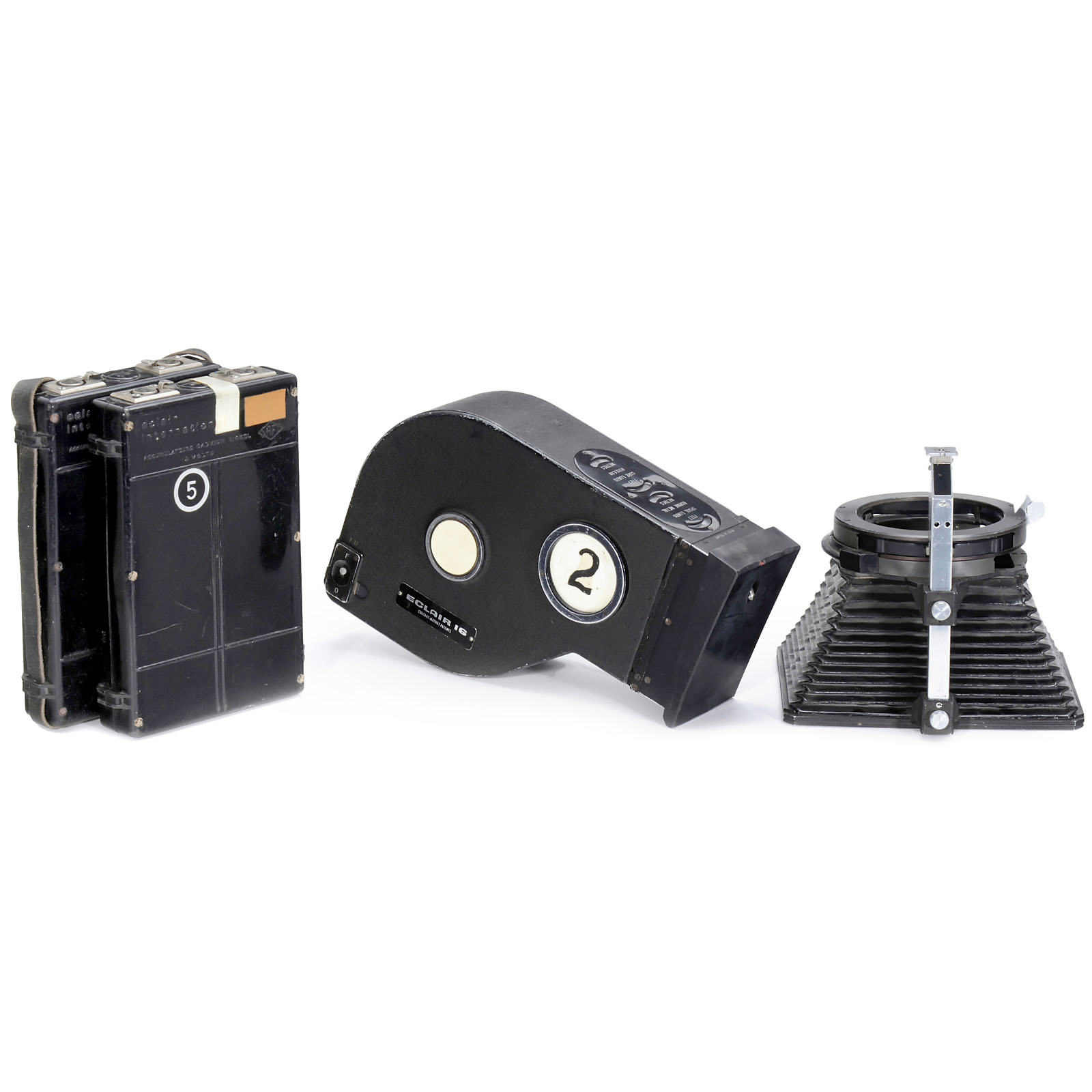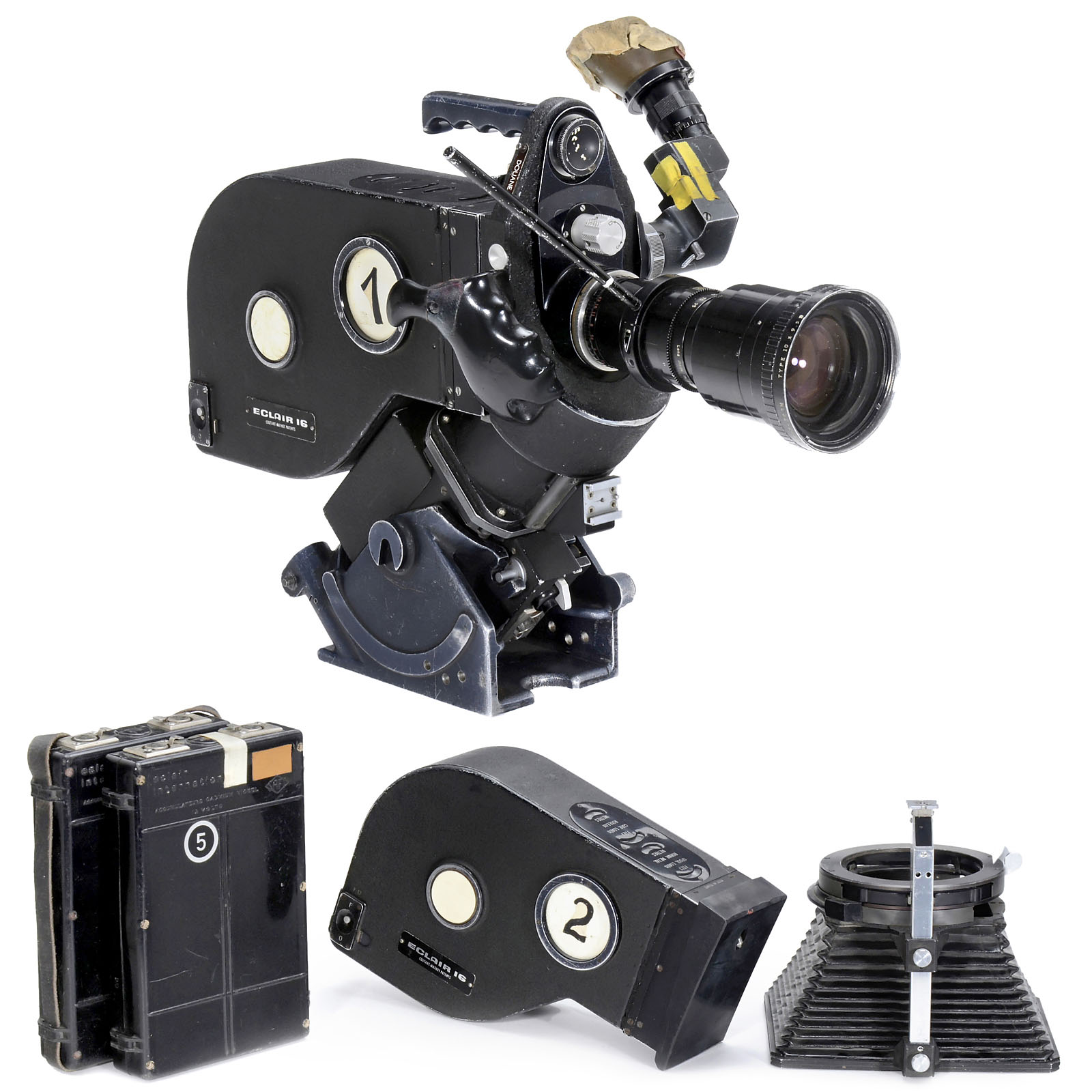 Eclair, Paris. 16 mm noiseless portable reflex camera, for 120 m magazines, lens: Angenieux 1:2,2/9,5–95 mm, with 2 magazines for 120 m film, compendium, cables, accessories and 2 original cases.