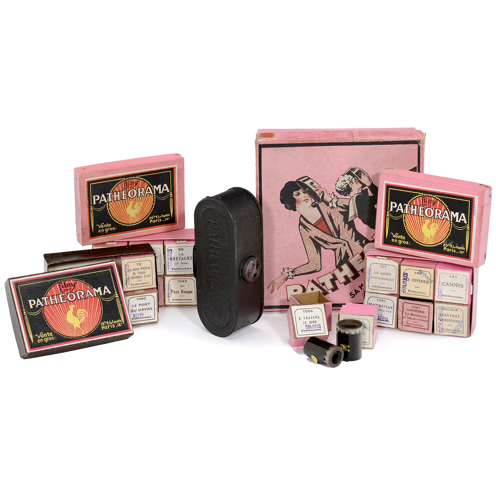 Pathé, Vincennes & Paris. 35mm film viewer for single-sided perforation film, with 18 films and all original boxes. A rare and early viewer.